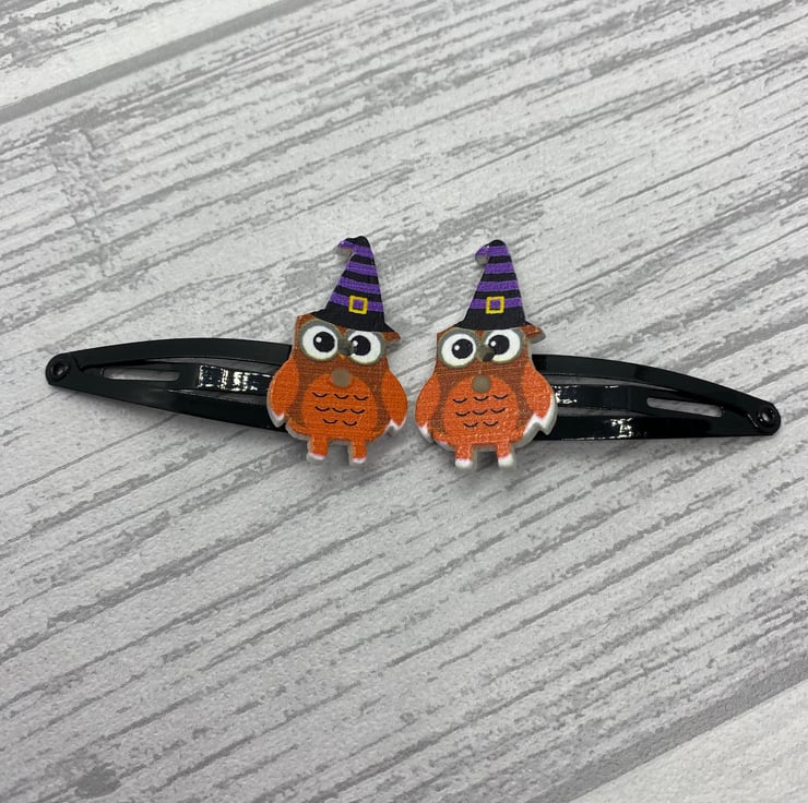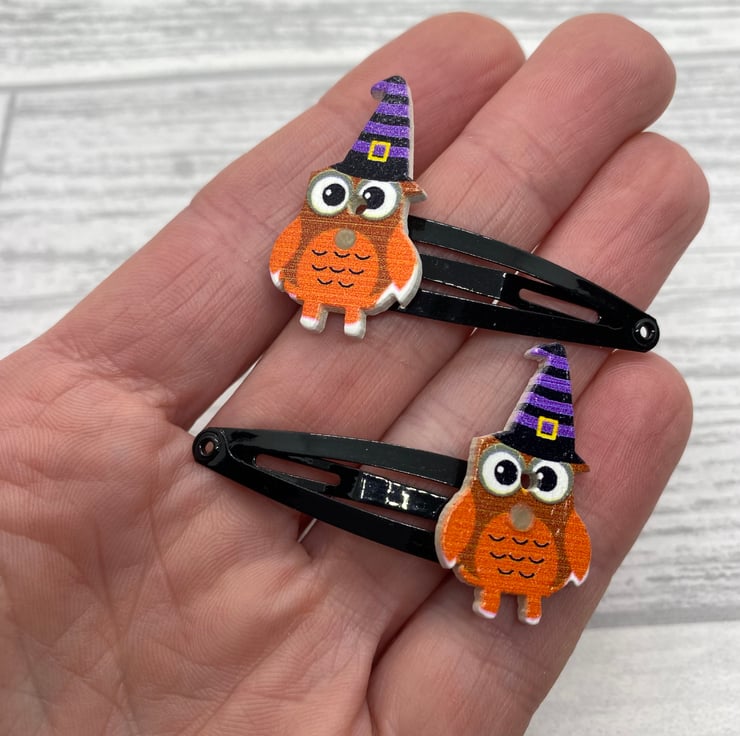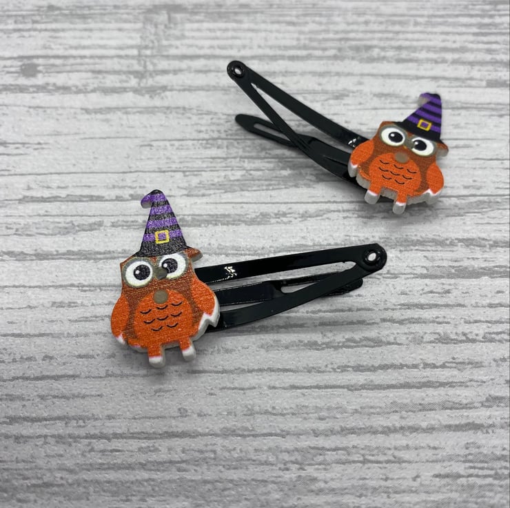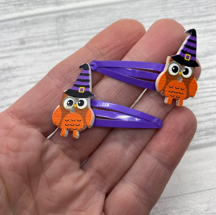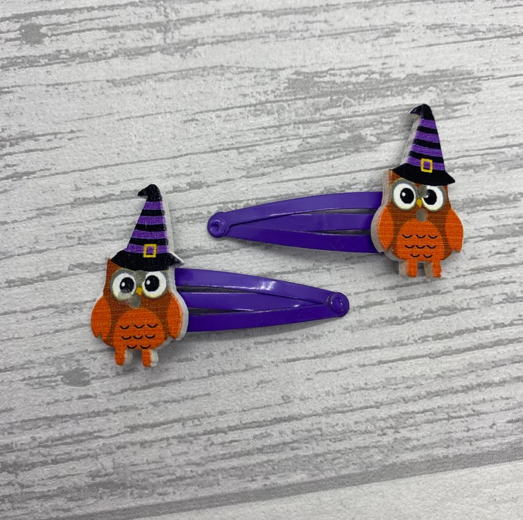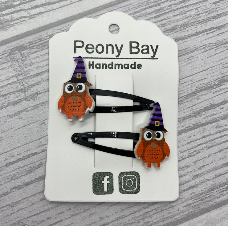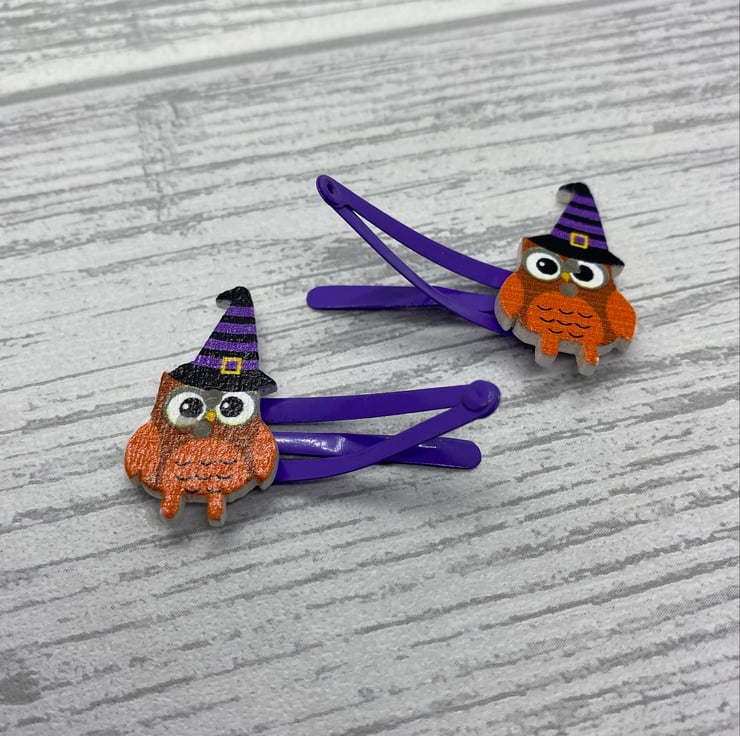 Have Halloween hair with these cute owl clips! These owls are dressed up for Halloween in striped witches hats. I’ve matched the colours in the hat with the snap clips, so they are available on purple and black clips. Please select your colour from the drop down menu.