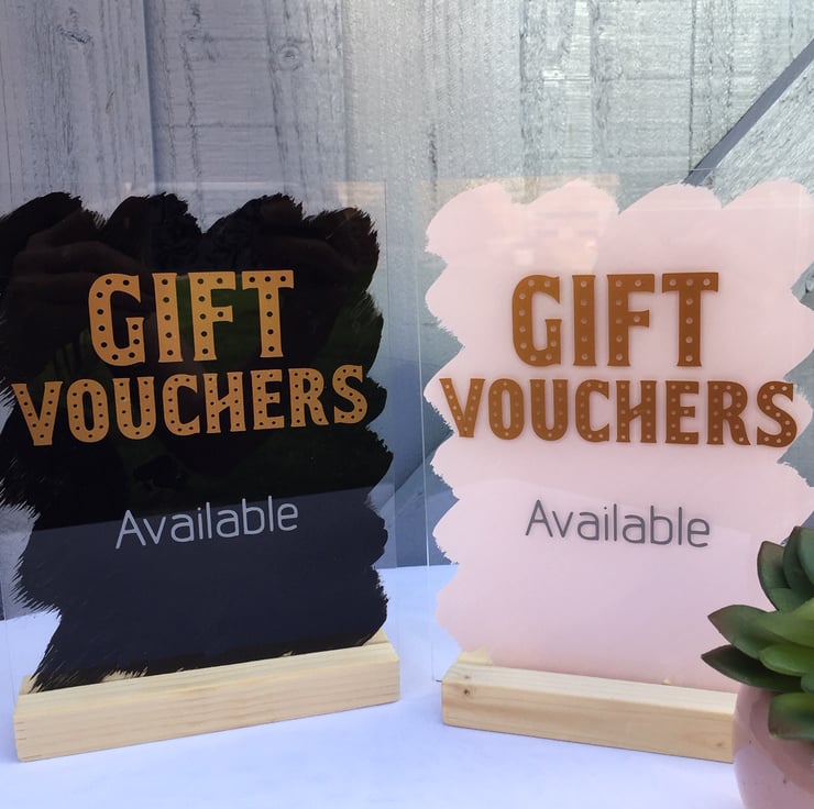 'GIFT VOUCHERS available' handpainted, hand-decorated acrylic sign for beauty salon, spa, retail shop, online entrepreneur, gift shop.