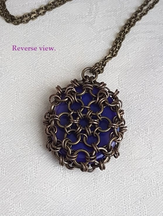 Unusual and unique chainmaille pendant with a gorgeous Purple Agate Cabochon (dyed, I assume).