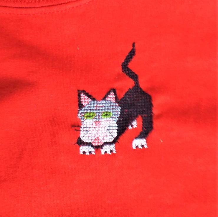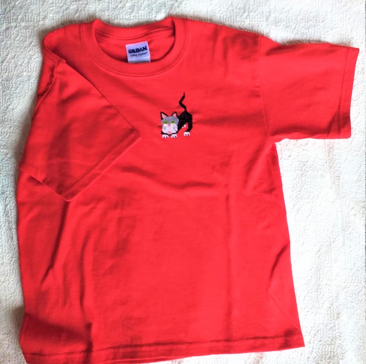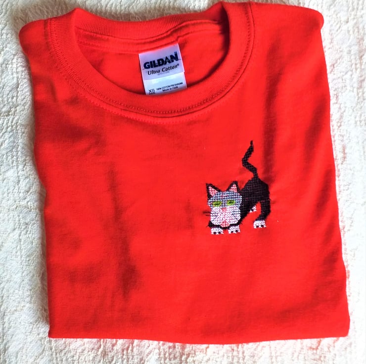 I have hand-stitched a black and white cat with green eyes, from a drawing of my own, on the front of this good quality, bright red Gildan T-shirt. Its tail is twitching. It's ready to pounce. The shirt is 100% cotton and machine washable, though, as it is such a deep red I recommend a cool wash.