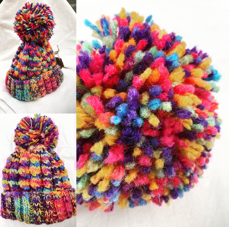 Knitted (by hand with actual knitting needles) uniquely designed, one-of-a-kind bobble hats for adults and children