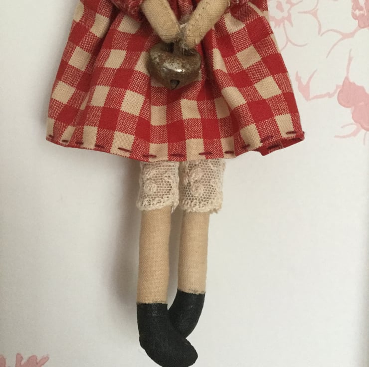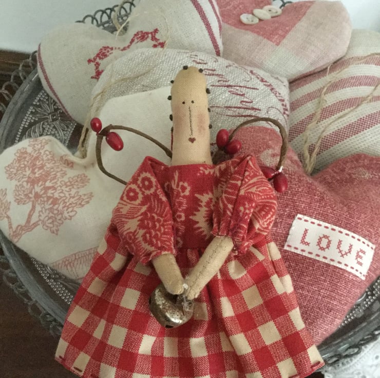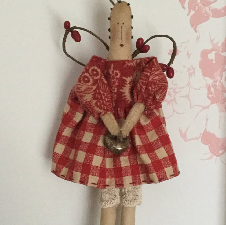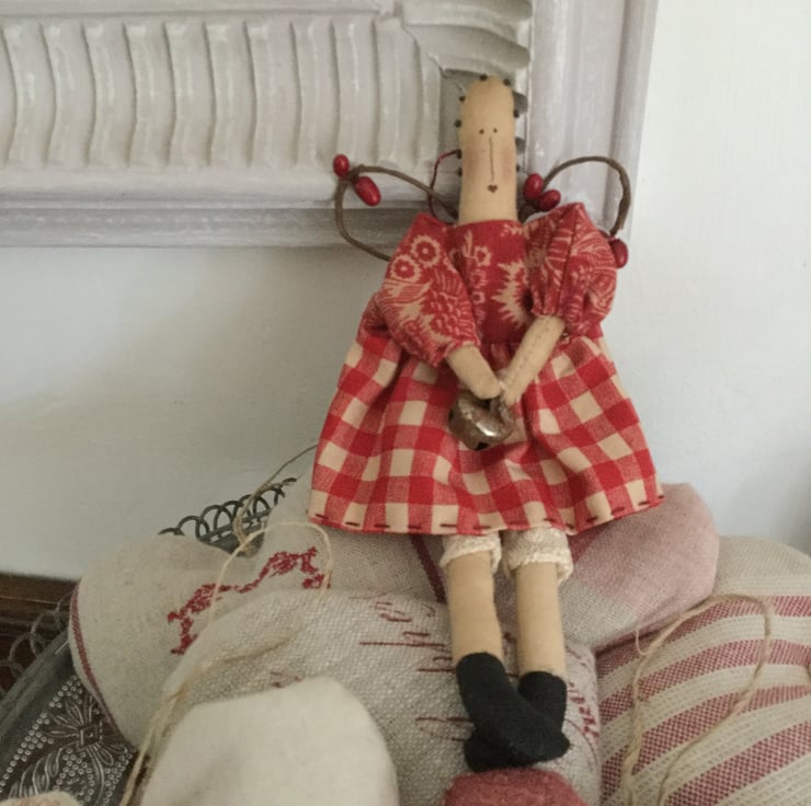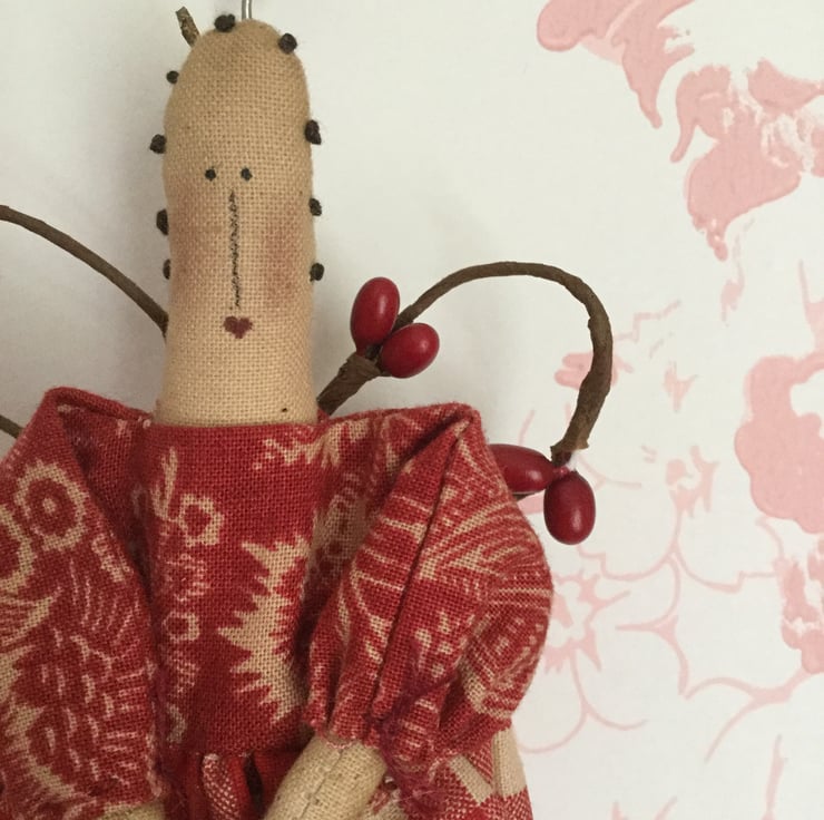This miniature homespun angel is approx 20cm long, The body is made from tea stained cotton. She is wearing bloomers made from vintage lace and her dress is made from two printed homespun fabrics, finished off with cuff ties.