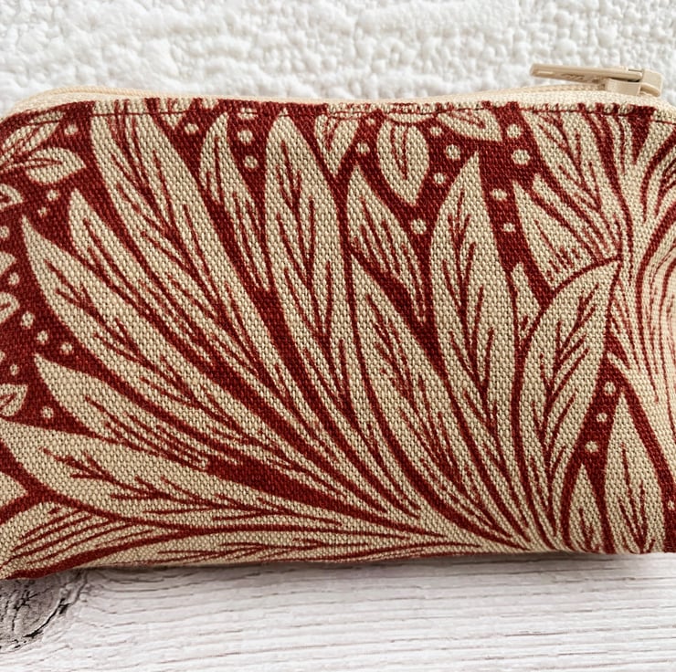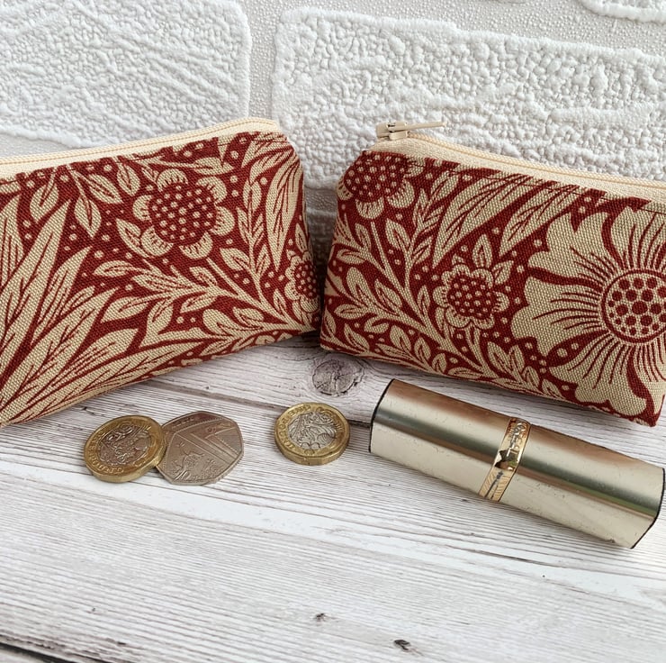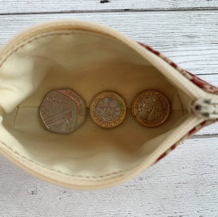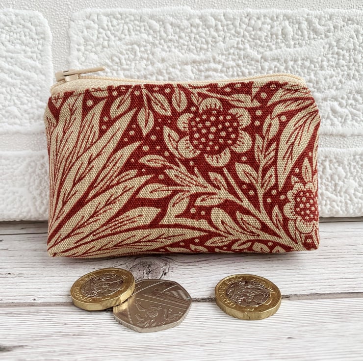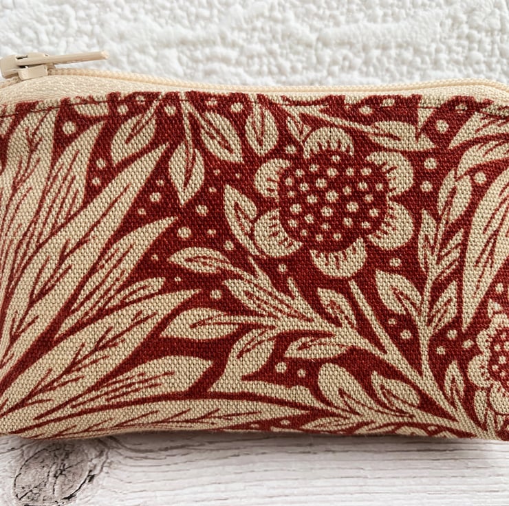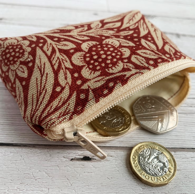 A handy small coin purse with a stylish floral pattern in red and cream. The fabric has a delightful Arts and Crafts style cream floral pattern on a red background. The pattern features stylised flowers amongst foliage and polka dots. The purse has a matching cream zip and is lined with cream fabric. The base of the purse is boxed to give more space inside.