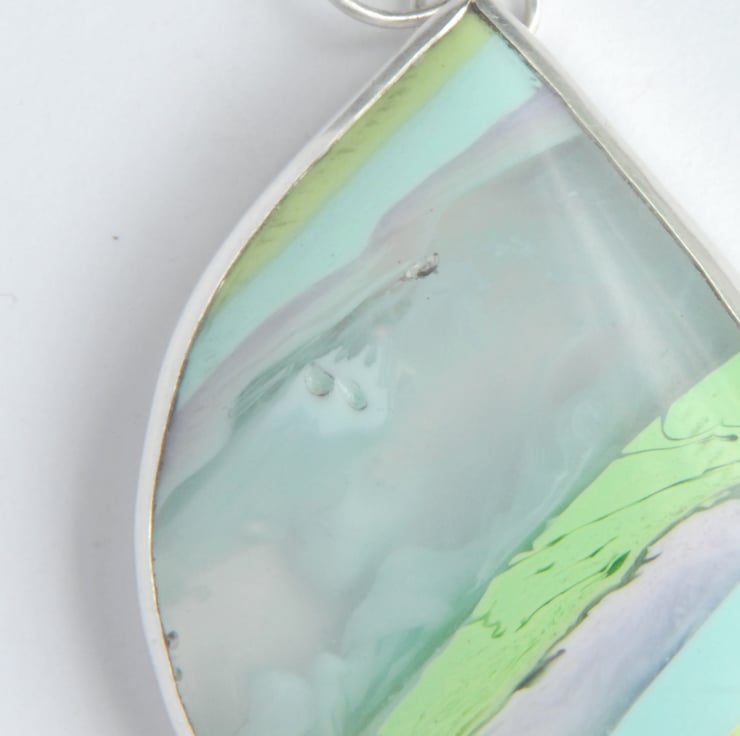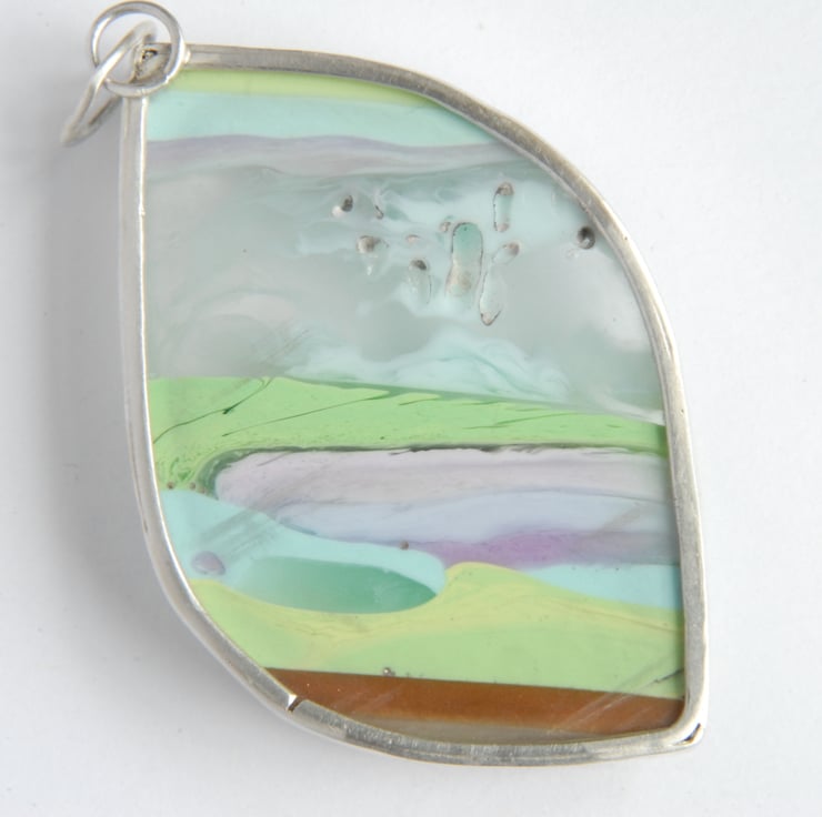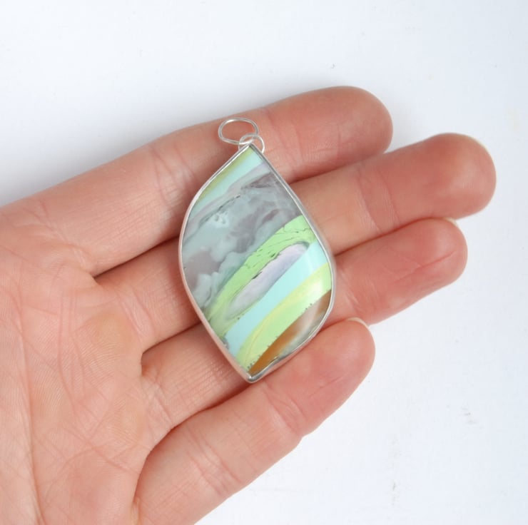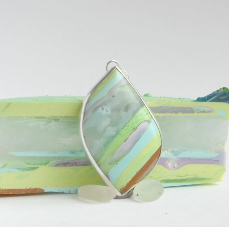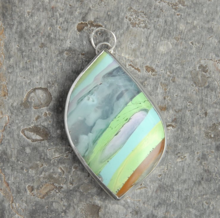 This freeform shaped pendant features pastel hued Cornish surfite bezel set in sterling silver, the surfite has diagonal stripes in pale green, pale blue, pink, lilac, gold and translucent (this band has whisps of opaque white in it like little clouds). This is a chunky pendant measuring approx 55mm (inc bail) by 30mm, it comes with a sterling silver snake chain but the bail is large enough to fit a ribbon or cord if you wanted to swap it over. The freeform leaf like shape has a wonderful tactile quality to it - you want to run your fingers over its curves and surfite is warm to the touch. The surface of the surfite has little dimples from air bubbles being trapped as the material was formed.