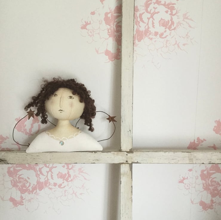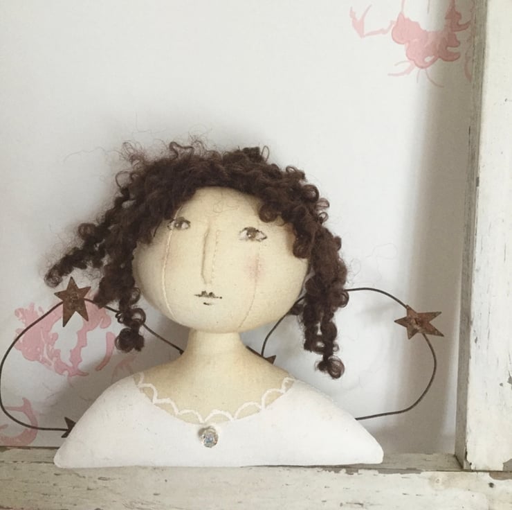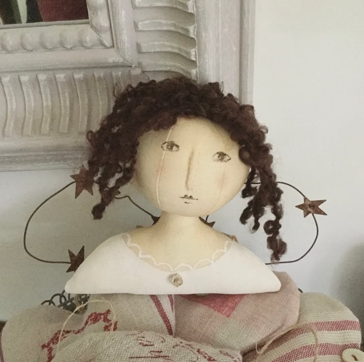The facial features are hand stitched and painted. Hand painted dress in white. Rusty wire and star wings