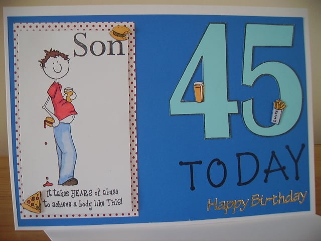 i place an blue colour card for the background than an white with red dots followed by an stamp image of an boy or men with an big belly i have use stamps for the food and hand colour myself i use an stamp number block for the 45 on blue card and cut out and place onto card i stamp the TO DAY with black ink i use gold colour peel-offs sticker for the Happy Birthday sentiment