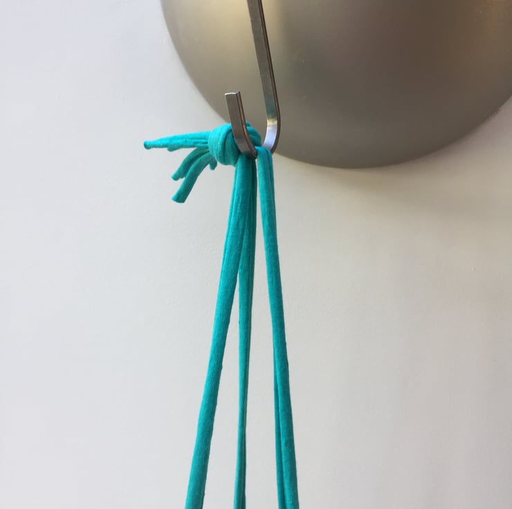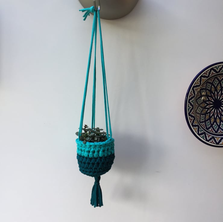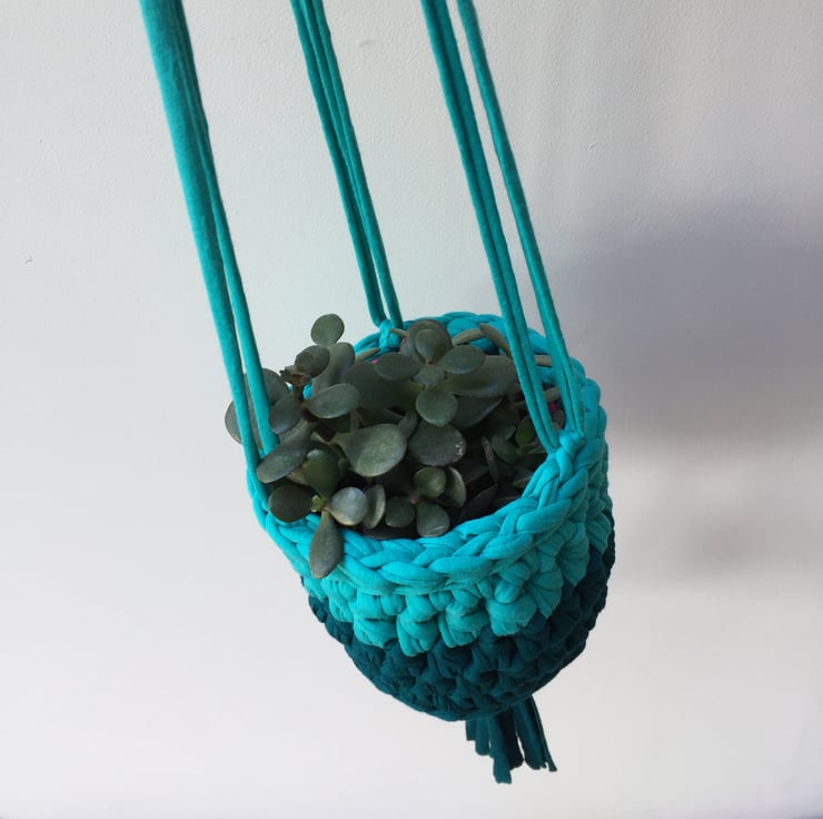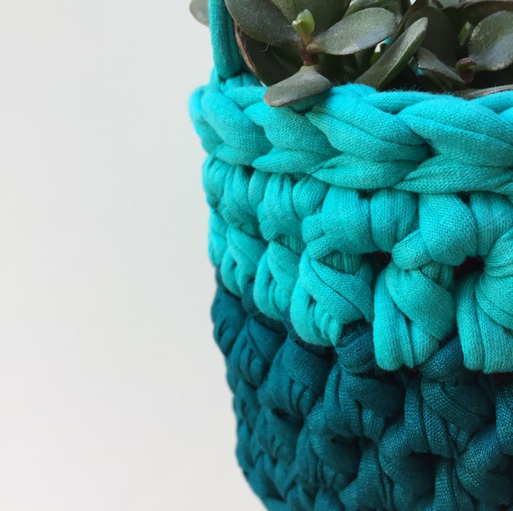 This planter would look lovely in a bathroom, bedroom or kitchen. It is crocheted by hand using tactile t-shirt yarn in two tones of teal, formed from the off-cuts from the textile manufacturing process. So not only does it look pretty but it's sustainable too!
