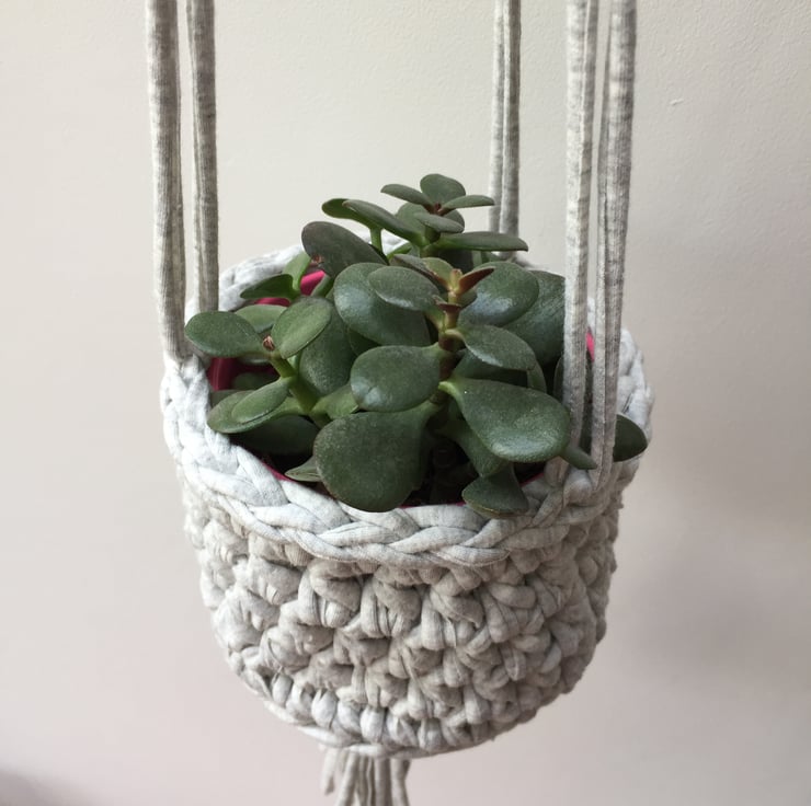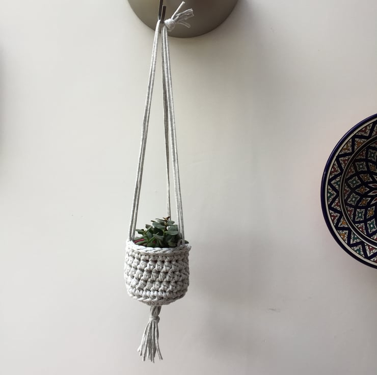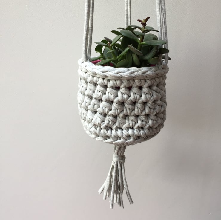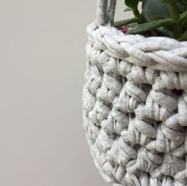 This planter would look lovely in a bathroom, bedroom or kitchen. It is crocheted by hand using tactile light grey t-shirt yarn, formed from the off-cuts from the textile manufacturing process. So not only does it look pretty but it's sustainable too!