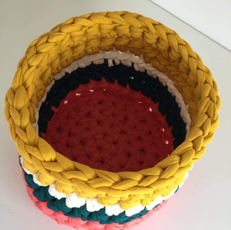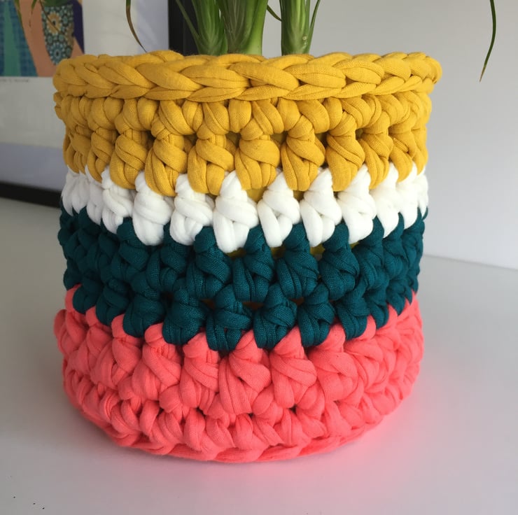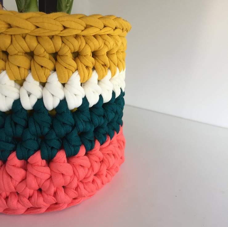 Made with sturdy upcycled textile yarn in bright and colourful shades of coral, teal, white and mustard yellow, the basket is approx 13m diameter and 14cm tall. It is designed to accommodate a standard 13cm plant pot but will stretch slightly to fit different shapes.