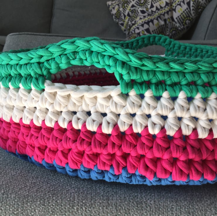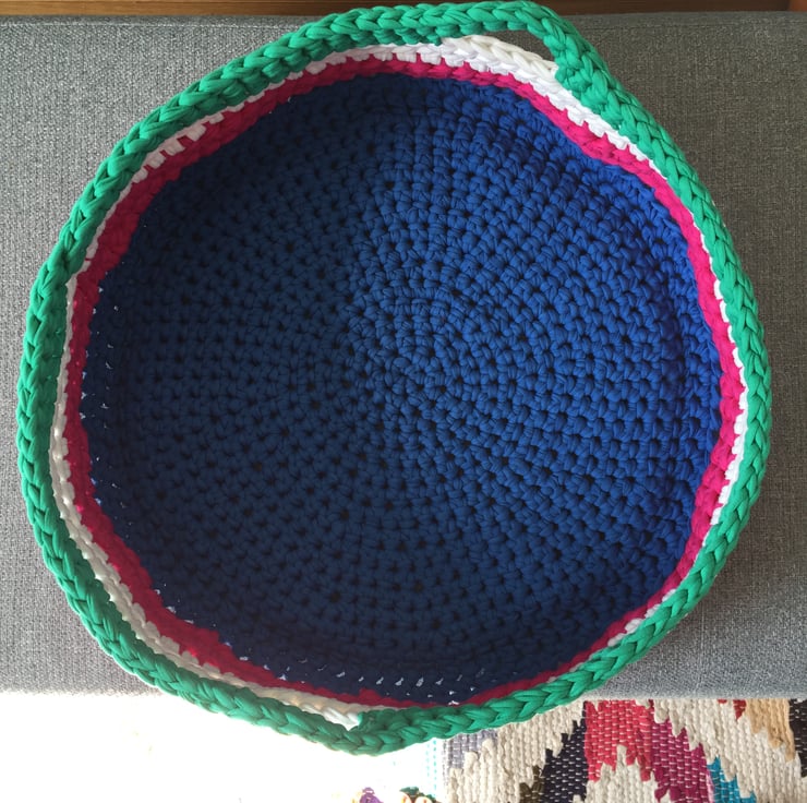 Crocheted using tactile chunky tshirt yarn, formed from the off-cuts from the textile manufacturing process. The ultimate in upcycling! The yarns used for this basket are cobalt blue, bright pink, white and grass green.
