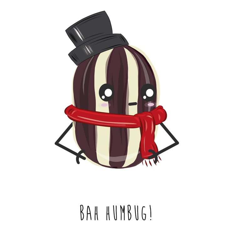 An A6 (folded) Christmas card made with 350gsm FSC card depicting a hand drawn humbug mint wearing a scarf and has a Scrooge type of expression. The card is silk coated on the outside to make the image pop and matt on the inside so you can easily write your own message.