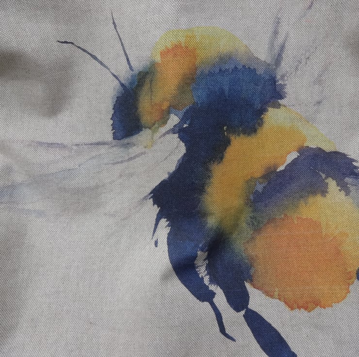 Back of cushion is in a black woven fabric which also has a zipper running along underside of contrast bee cotton fabric.