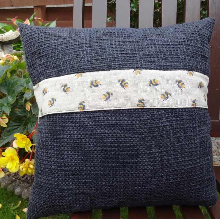 Back of cushion is in a black woven fabric which also has a zipper running along underside of contrast bee cotton fabric.