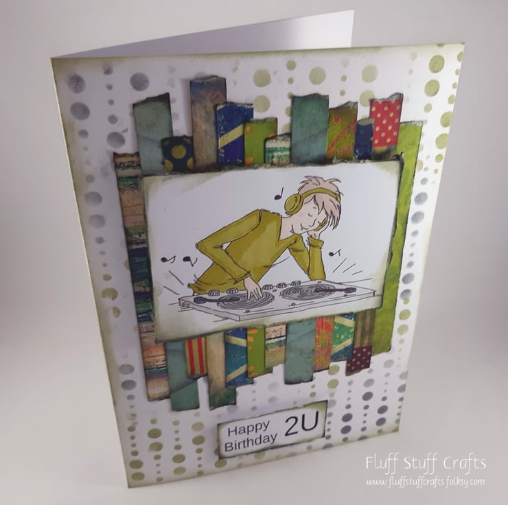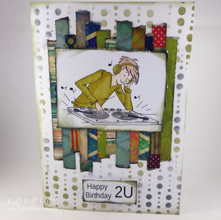 A5 birthday card for the musical teenager in a grungy style. The card features a hand coloured image of a boy at his mixing desk. The image has been edged in distress inks and overlaid onto different coloured paper strips, also distressed. The card has been given a stencilled, patterned background of black and green dots. The sentiment, also distressed, reads 'Happy Birthday 2U'.