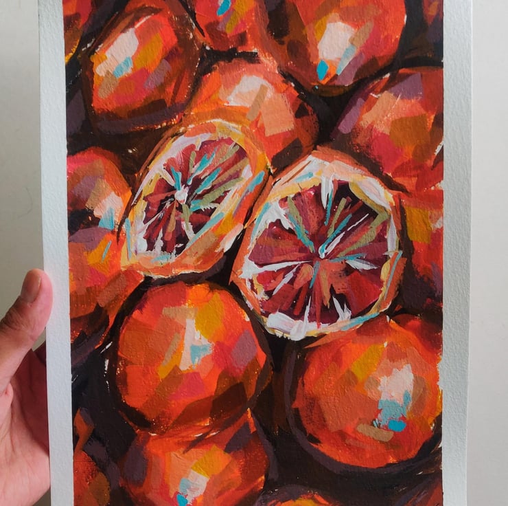 An original painting of oranges completed with acrylic paint on 300gsm paper. A fabulous painting to have framed and displayed in the kitchen, or anywhere else!