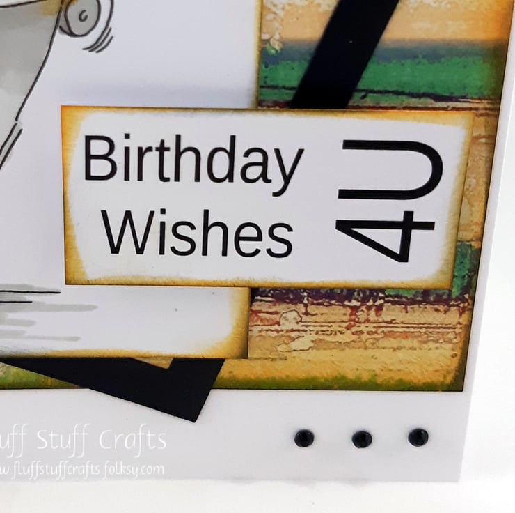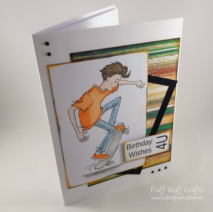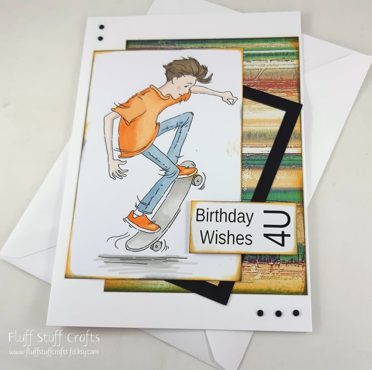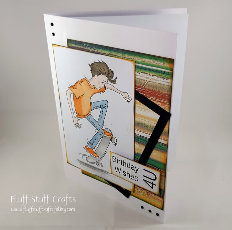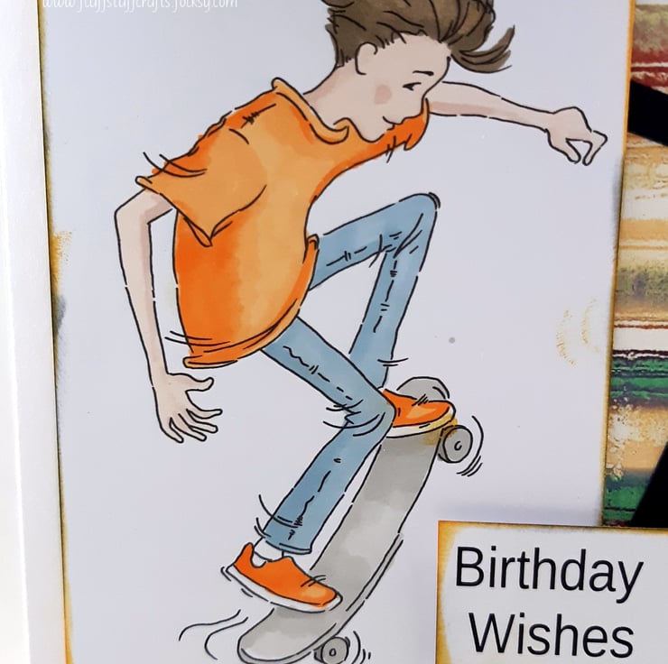 Birthday card in a grungy style, suitable for teenage boys. The card features a hand coloured image of a boy on his skateboard, over a distressed, multicoloured background, with a partial black frame. The card is embellished with small black gems. The sentiment reads: 'Birthday Wishes 4U'.