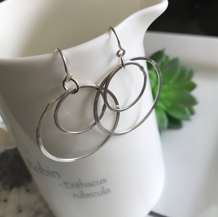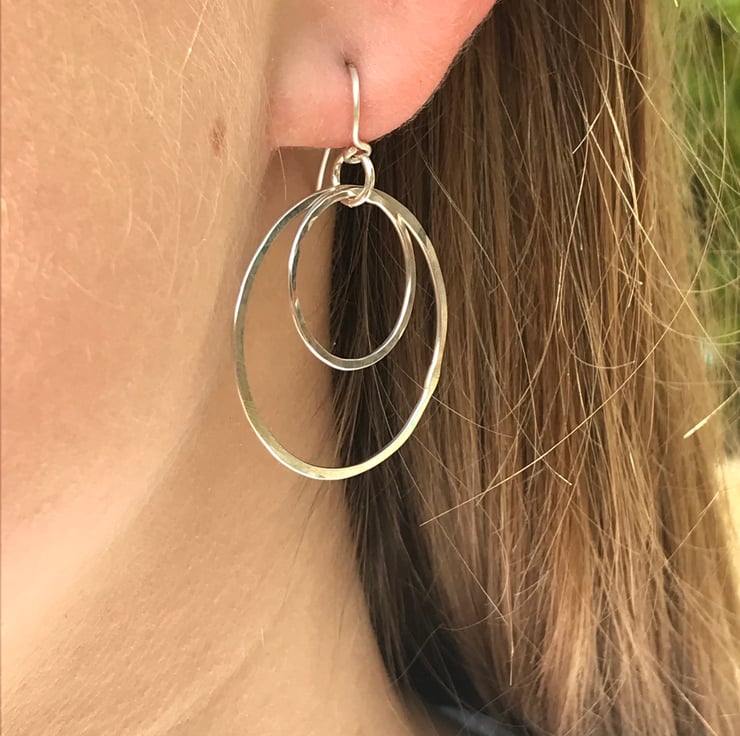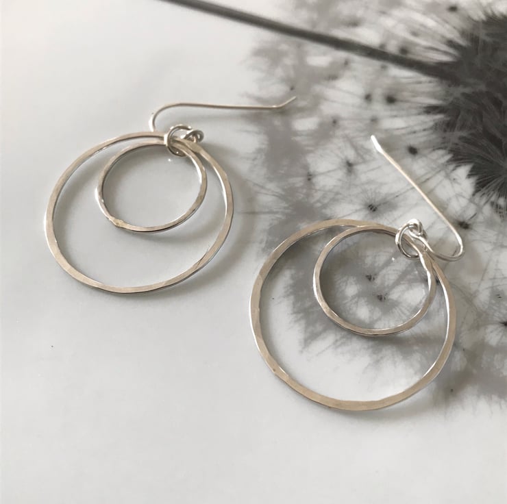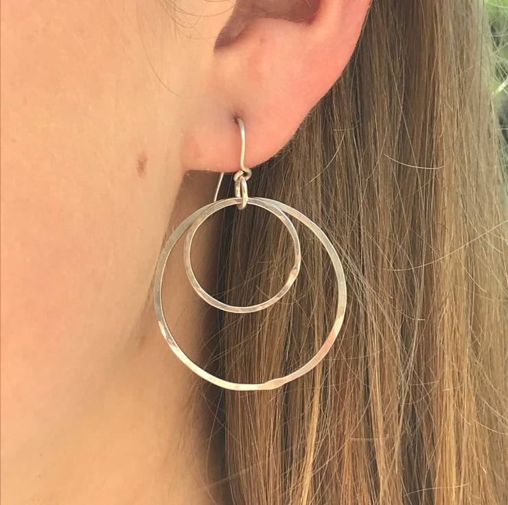 Hand forged sterling silver double hoop earrings comprising of two different sized silver hoops which have been lightly hammered to create a beautiful, slightly sparkly finish. The diameter of each hoop is 32mm and 19mm. They are finished with handmade 0.8mm sterling silver ear wires.
