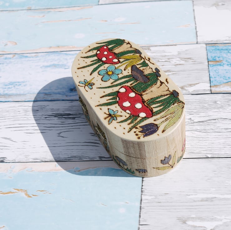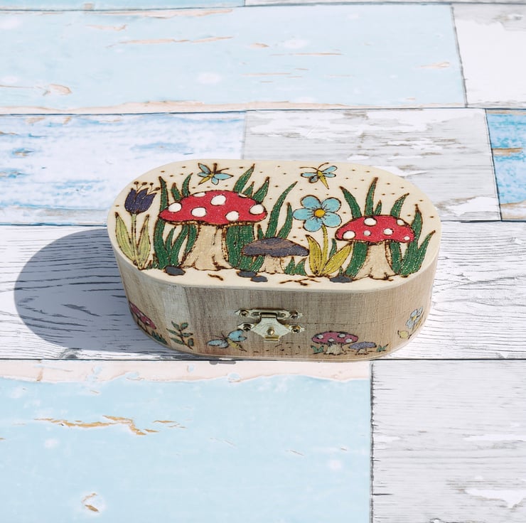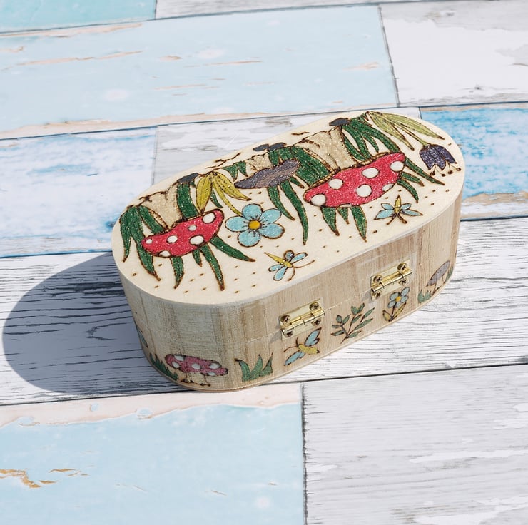Sweet little wooden box featuring a hand drawn design burnt into the wood using traditional methods of Pyrography. On the lid is a scene of mushrooms & red toadstools surrounded by grass. The white dots on the toadstools are slightly raised. Around the edge of the box are smaller toadstools and dragonflies. All hand painted.