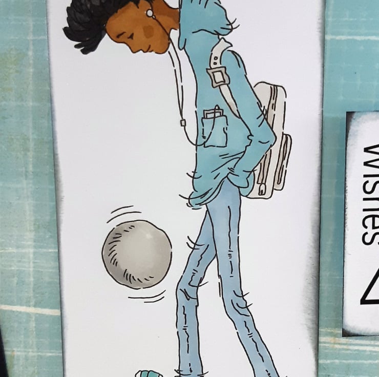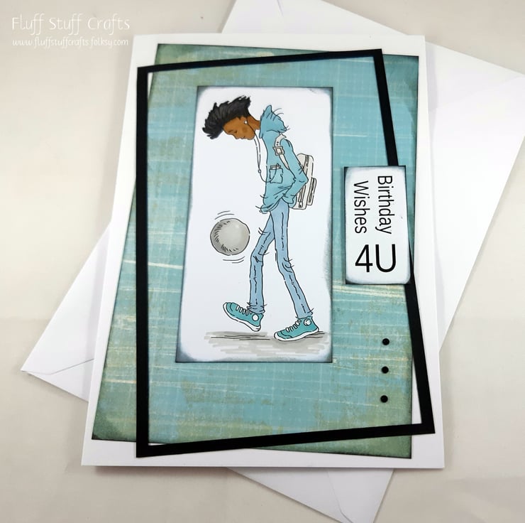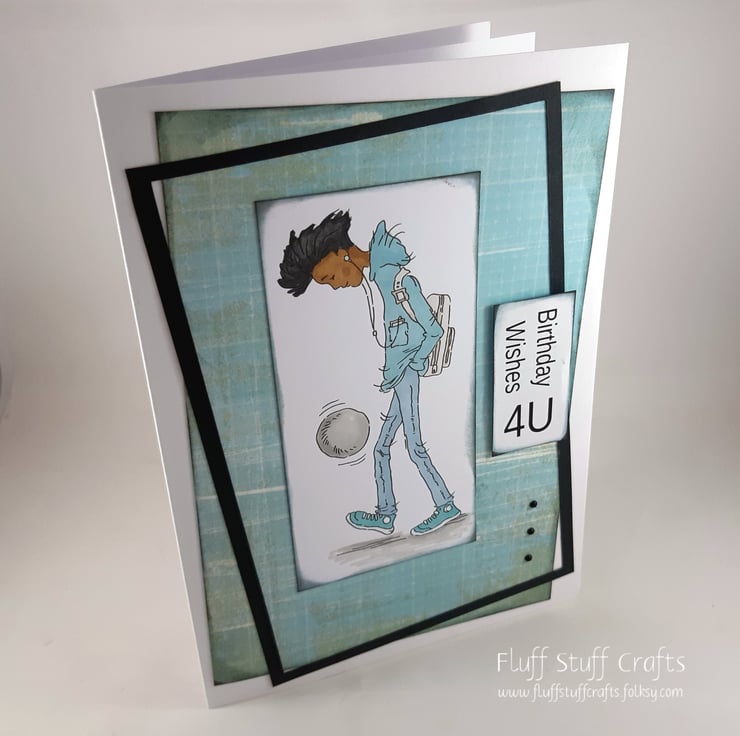 A5 sized birthday card suitable for teenagers or twentysomethings featuring a hand coloured image of a boy playing football. The image and sentiment 'Birthday Wishes 4U' have both been edged in grey distress ink and layered over a turquoise checked background within a black frame. The card has been embellished with 3 small black gems.