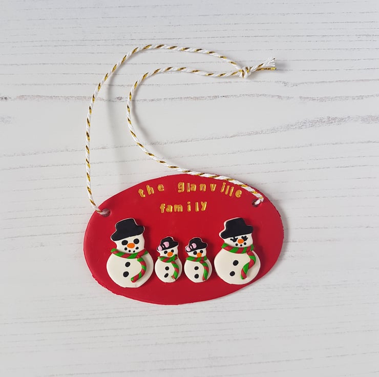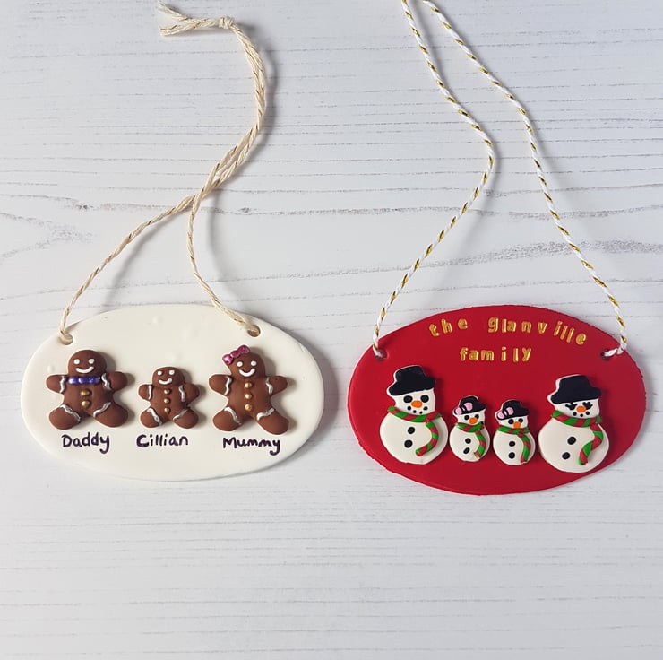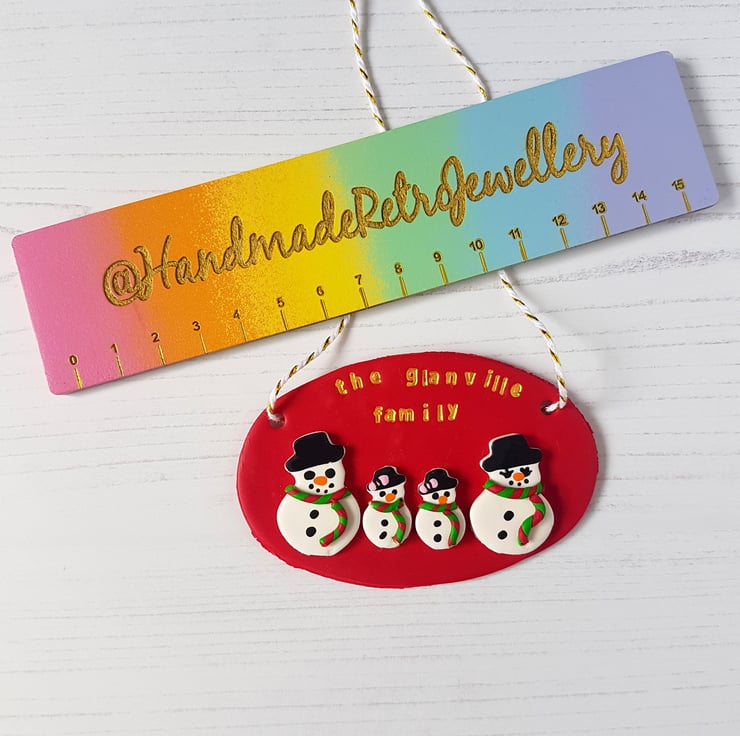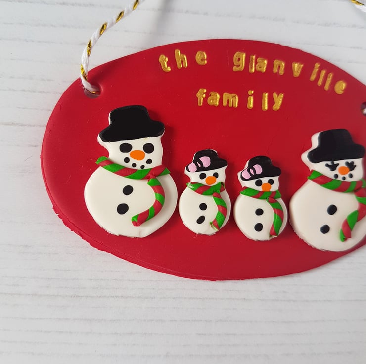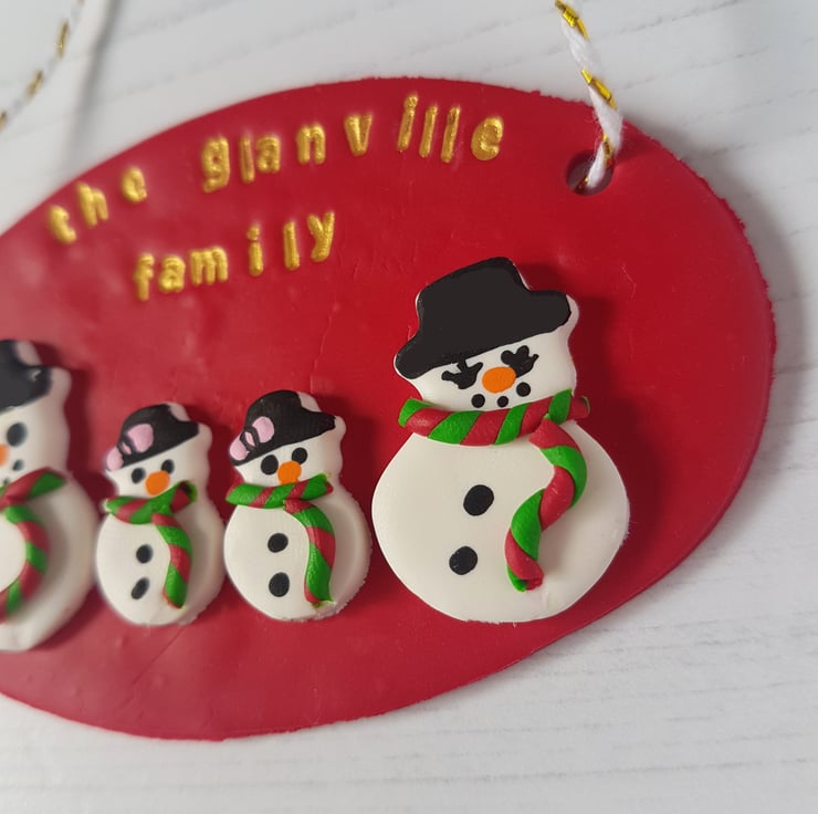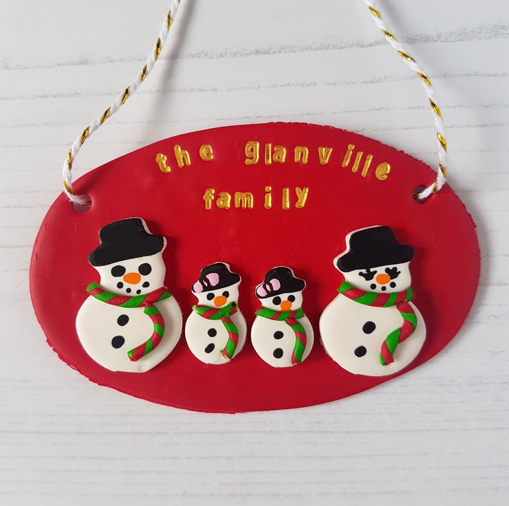 The plaque and figures are handmade in polymer clay, with detail painted using acrylic paint. (a pink bow is painted on girl snowman hats for clarity.)