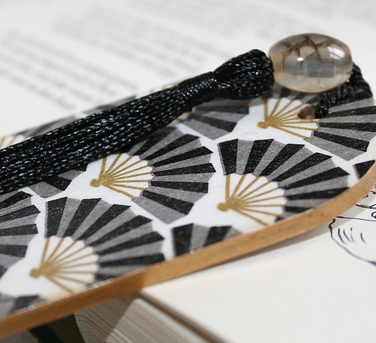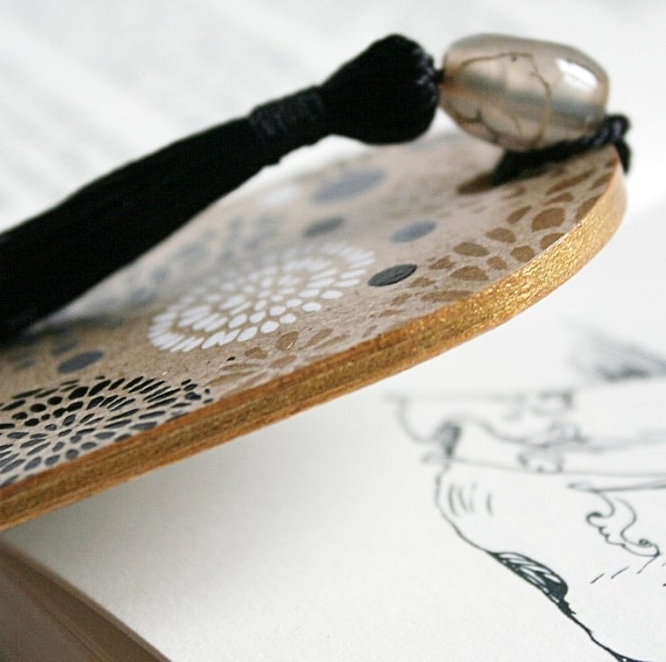 A birchwood bookmark transformed with napkin paper and card paper, with hand painted gold detail and a varnished finish.