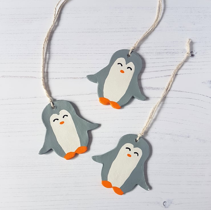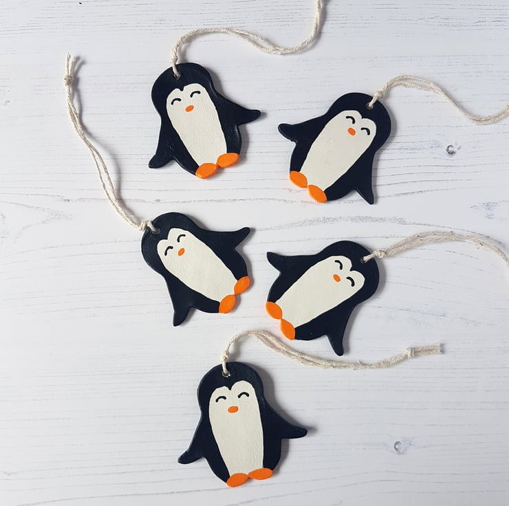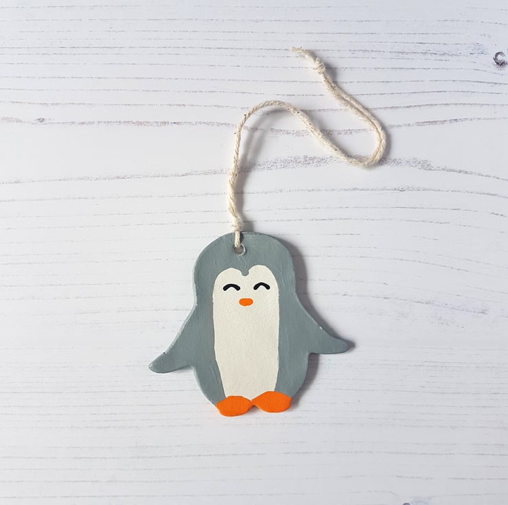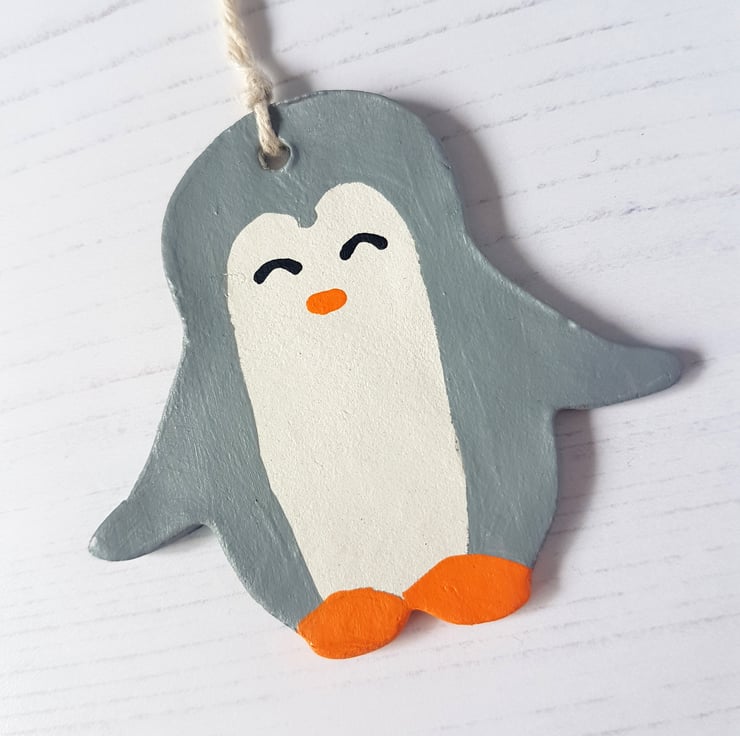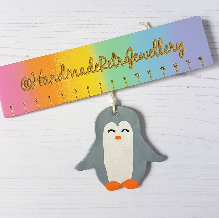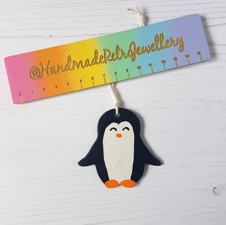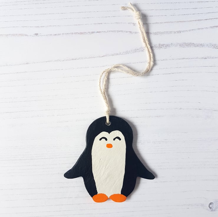 This cute penguin shaped decoration is made of air dry clay, then hand painted using acrylic paint, with the decoration finally sealed using a varnish to protect.
