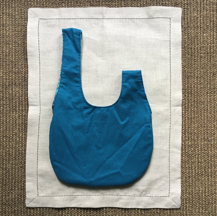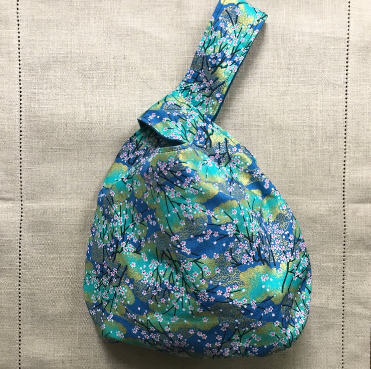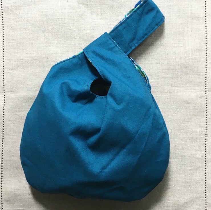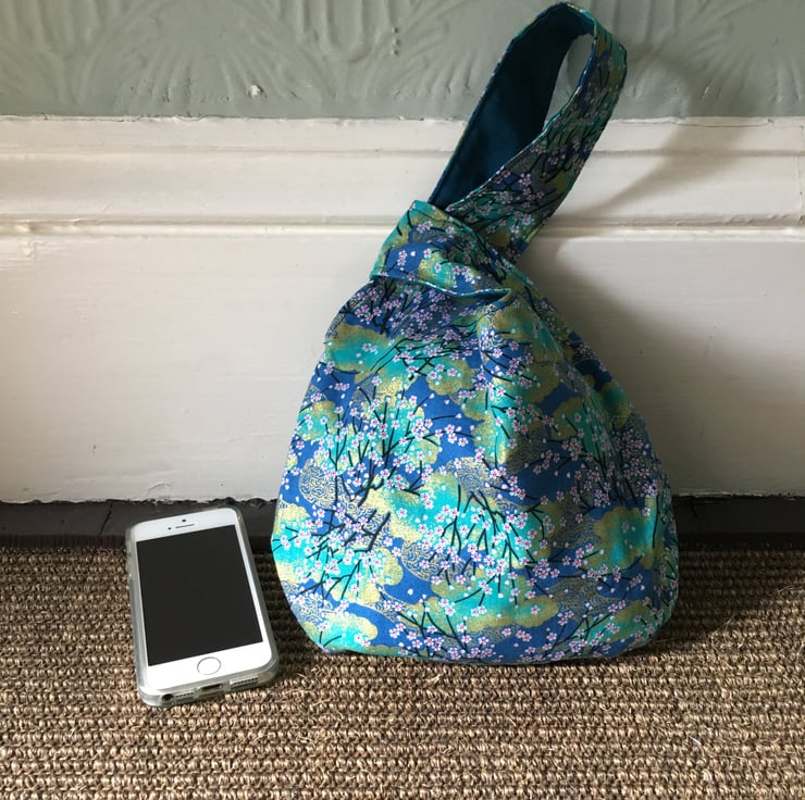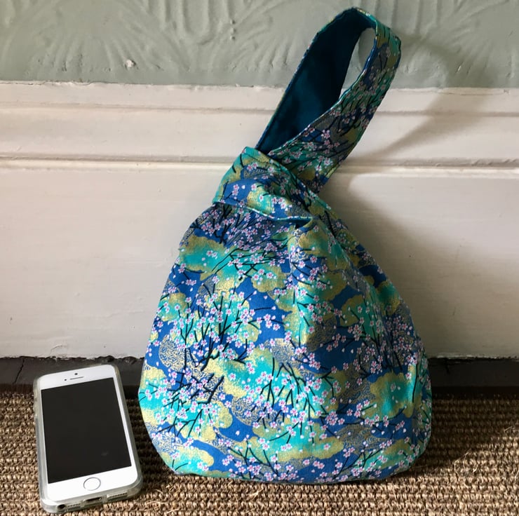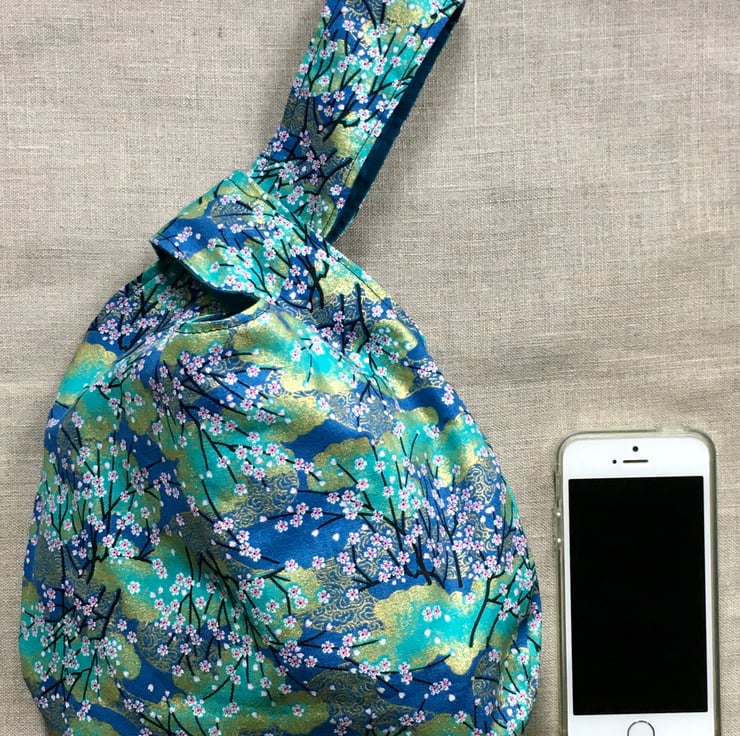 This reversible Japanese knot bag is made from the beautiful Japanese gilded turquoise tiny blossoms cotton fabric. The second fabric is a complimentary turquoise cotton. It is the perfect size for an evening bag, or a small handbag. It will fit a small purse, phone and other essentials. It is self-locking, and fits comfortably around the wrist and lower arm.
