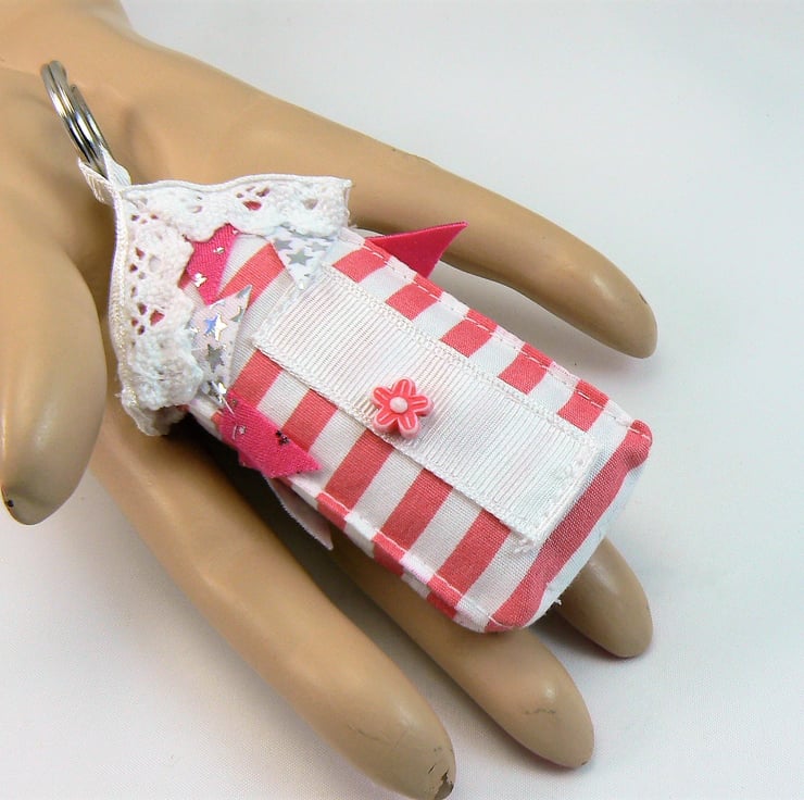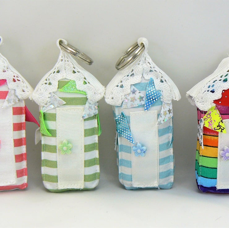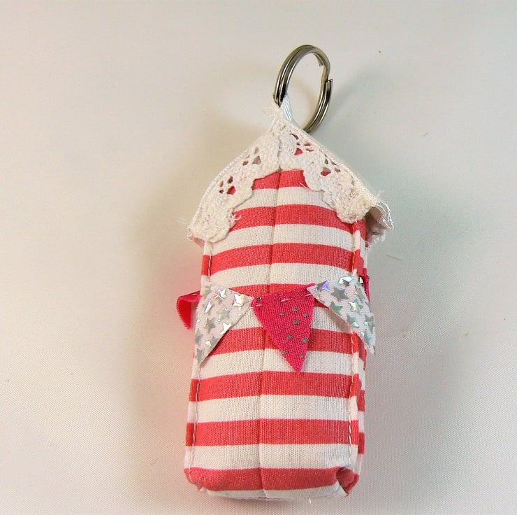 This cute little beach hut Keyring has some hologram sparkly bunting and a little flower door handle - It has been machine and hand sewn (not a glue gun in sight!) and therefore is fully washable (cool water).