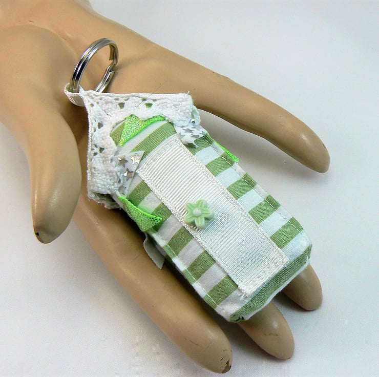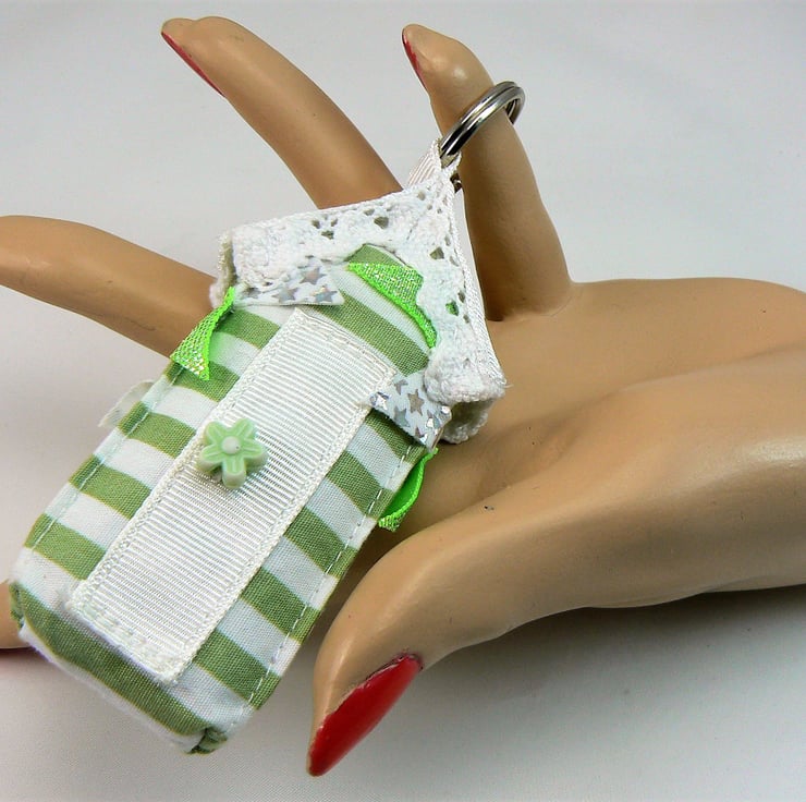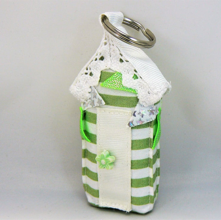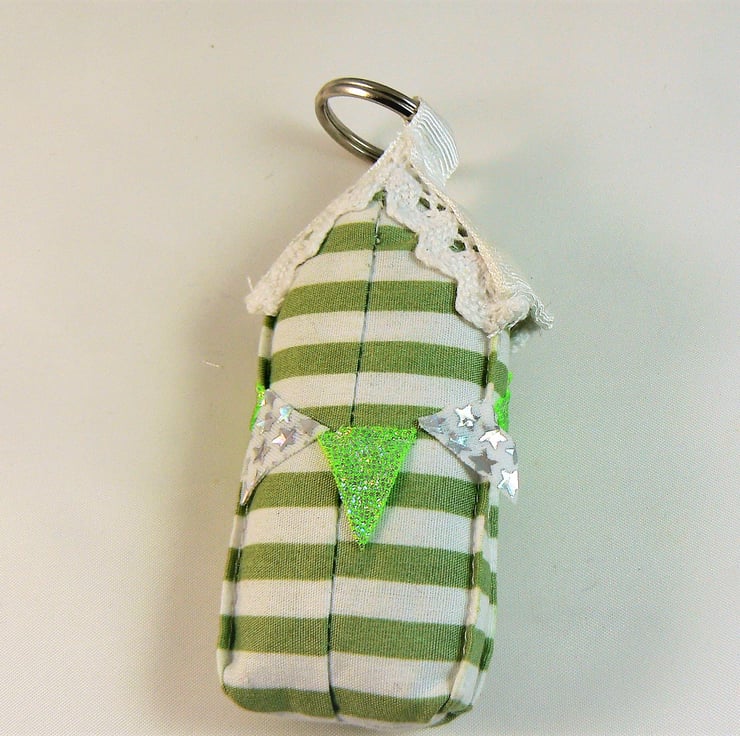 This cute little beach hut keyring has some hologram sparkly bunting and little flower door handle - it has been machine and hand sewn (not a glue gun in sight!) and therefore is fully washable (cool water).