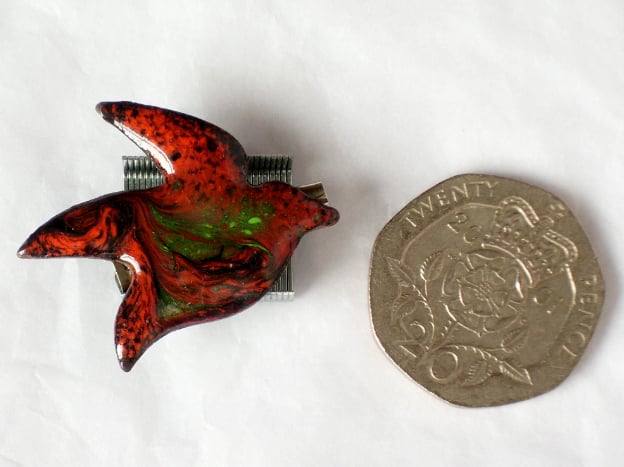 The bird is 28mm beak to tail, 24mm wingtip to wingtip. It has a 21mm brooch bar soldered to the back; the pin secures with a rotating catch.
