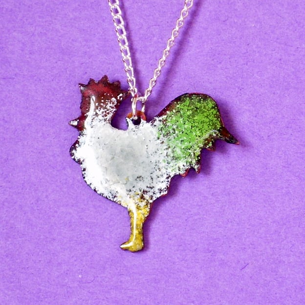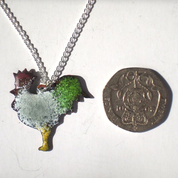 After building up several layers of clear enamel I have applied the colours, green, white, grey, yellow and red, using a stencil technique. In places the copper beneath the colours shows through in golden brown, intimating the iridescence of the cockerel's plumage.