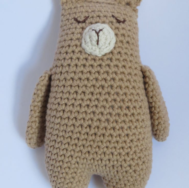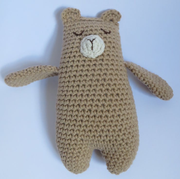 He has been made with a thick 100% cotton yarn which has a lovely soft texture and is filled with squishy 100% hi-loft polyester toy stuffing. His arms are unstuffed so are floppy and can be moved up and down, adding to his charm. Teddy has hand embroidered sleepy eyes and nose stitched with dark brown cotton embroidery thread.
