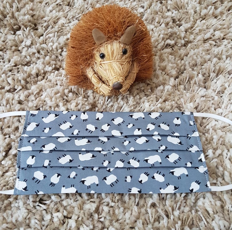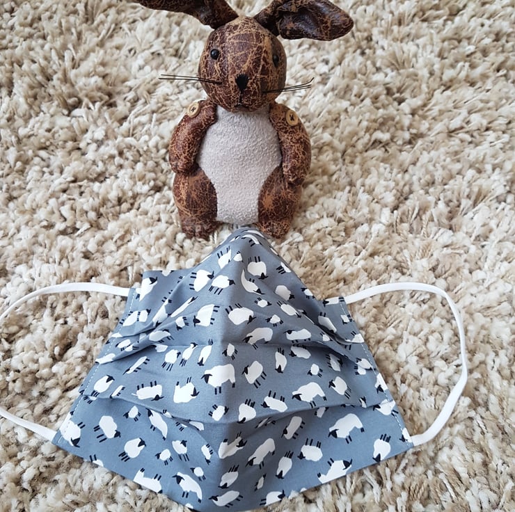 Small Adult/Teenager face covering made from a little sheep print on grey cotton. The face mask is made with 2 layers of cotton forming an inner pocket for a filter (not included) and is fastened over the ears with 2 loops of elastic and a toggle adjuster.