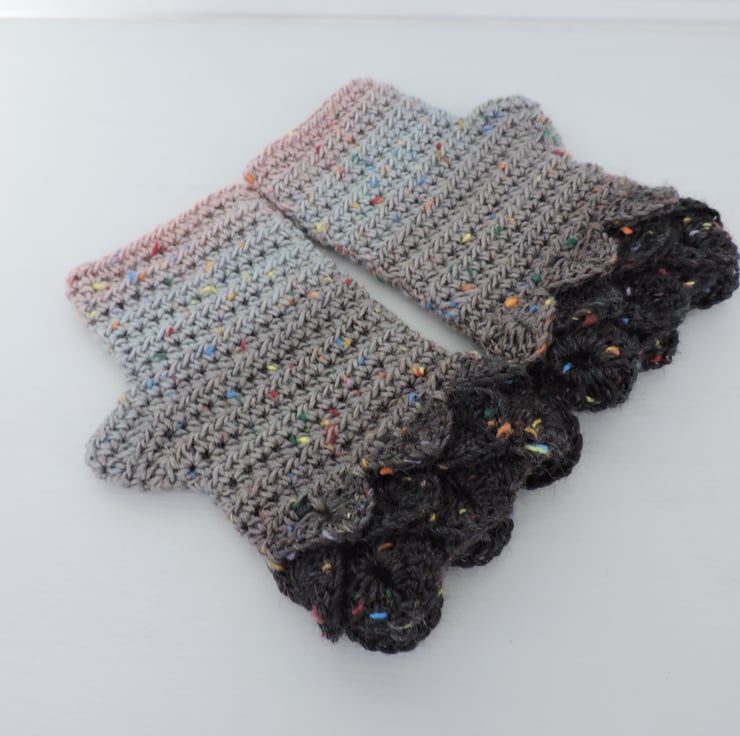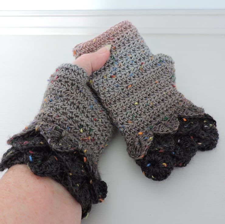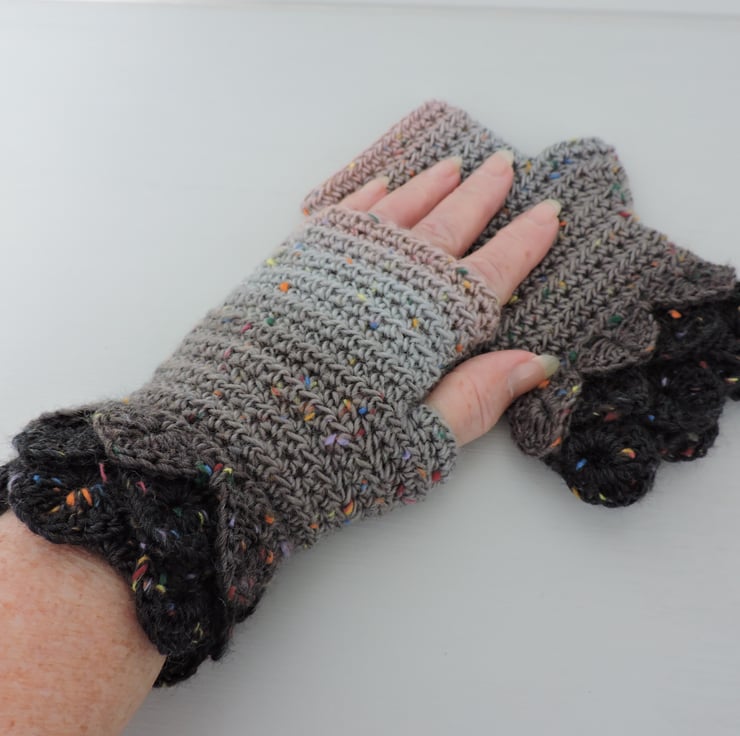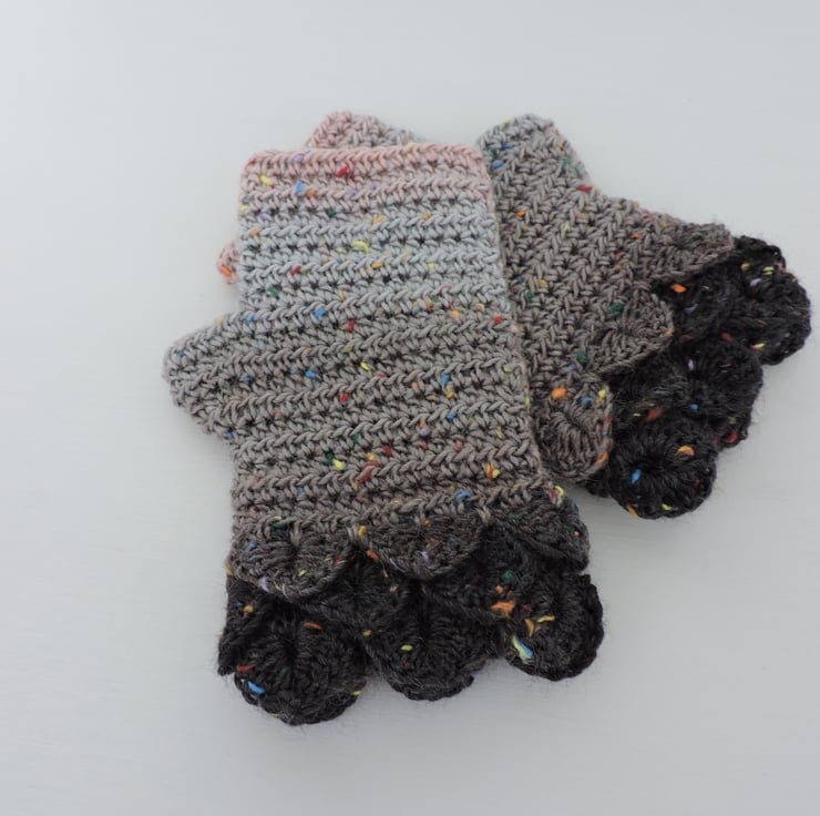 Sale was £12.50 now £8.50 I've crocheted these fingerless dragon scale cuff mitts in an acrylic and wool yarn. A graduated coloured yarn of black, charcoal, grey and the merest hint of pale pink with a smattering of tweedy bits throughout. . Dragon scale cuffs and a plain body. Warm and cosy, ideal for the cold weather