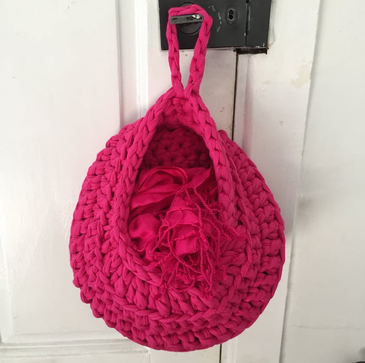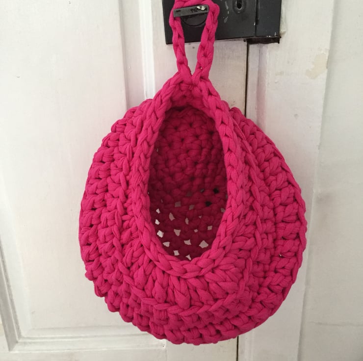 A crochet hanging basket, perfect to hang on a hook or door handle near your front door to store face coverings, scarves and keys.