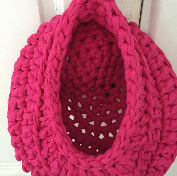 The yarn used for this basket is bright pink and is very strong and washable. I also have a variety of other colours available - message me for details!