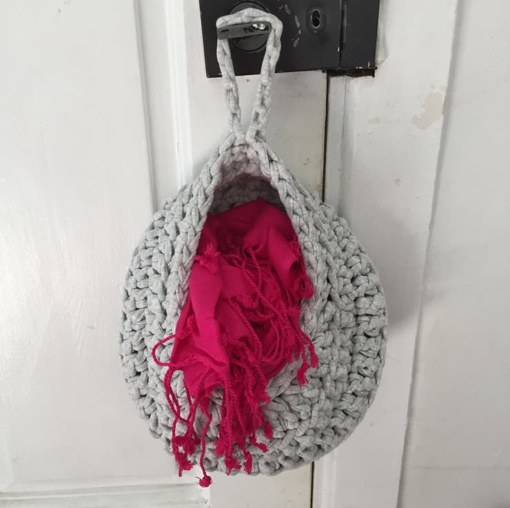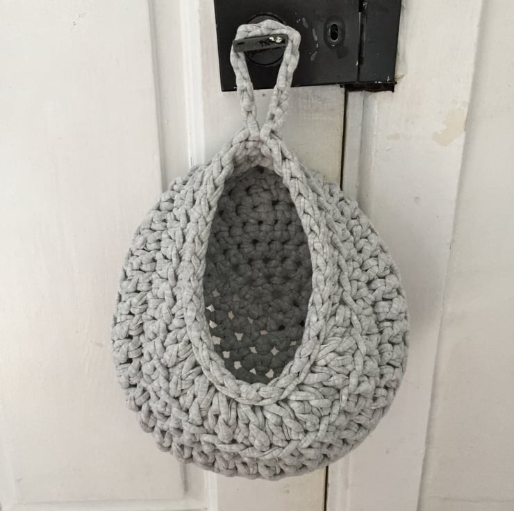 A crochet hanging basket, perfect to hang on a hook or door handle near your front door to store face coverings, scarves and keys.