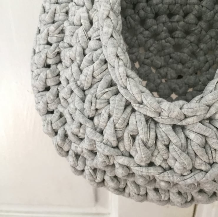 Crocheted using tactile chunky fabric yarn, formed from the off-cuts from the textile manufacturing process. The ultimate in upcycling!