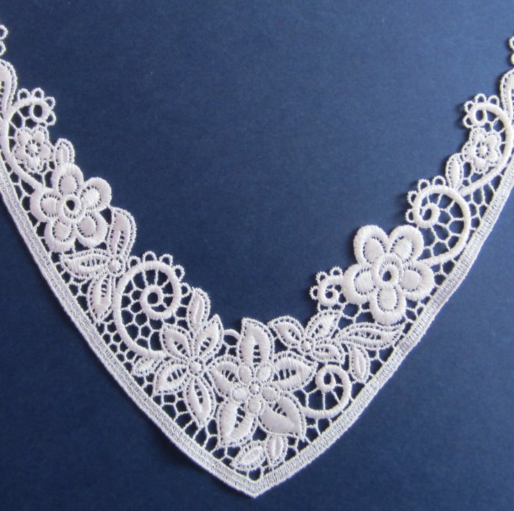 Good quality ivory coloured lace v neck embellishment. Can be used on t. shirts, bridal wear, lingerie etc. or motifs can be cut out and used individually.