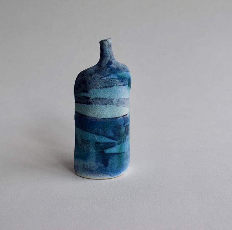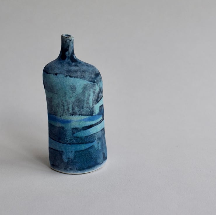 A stoneware ceramic bottle with glaze application inspired by the sea and shore. This little bottle sits well on it's own and would make a lovely gift for a birthday or wedding present for those who love to wander by the ocean.