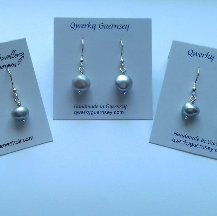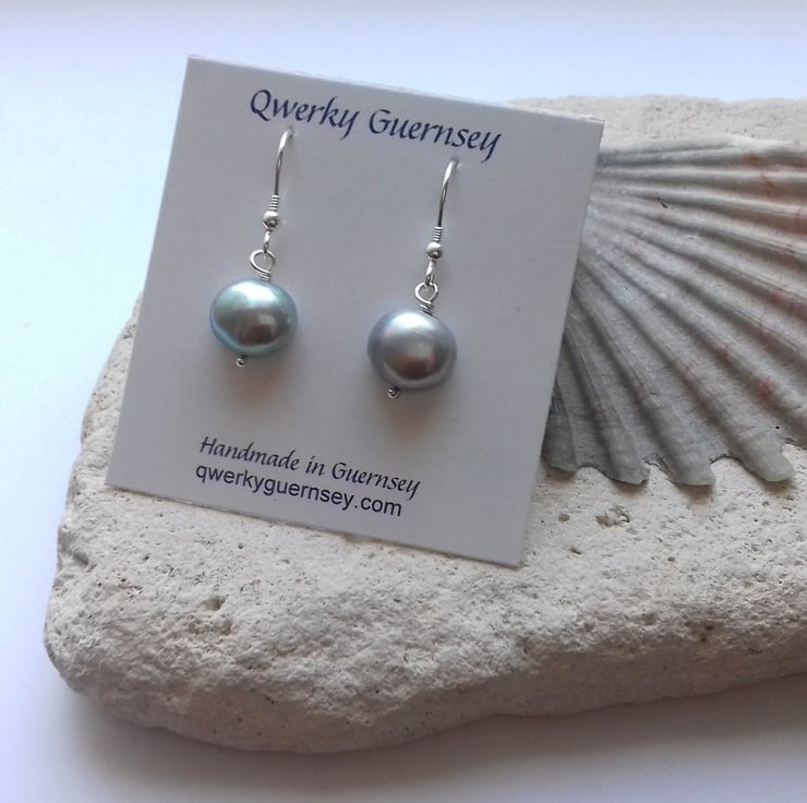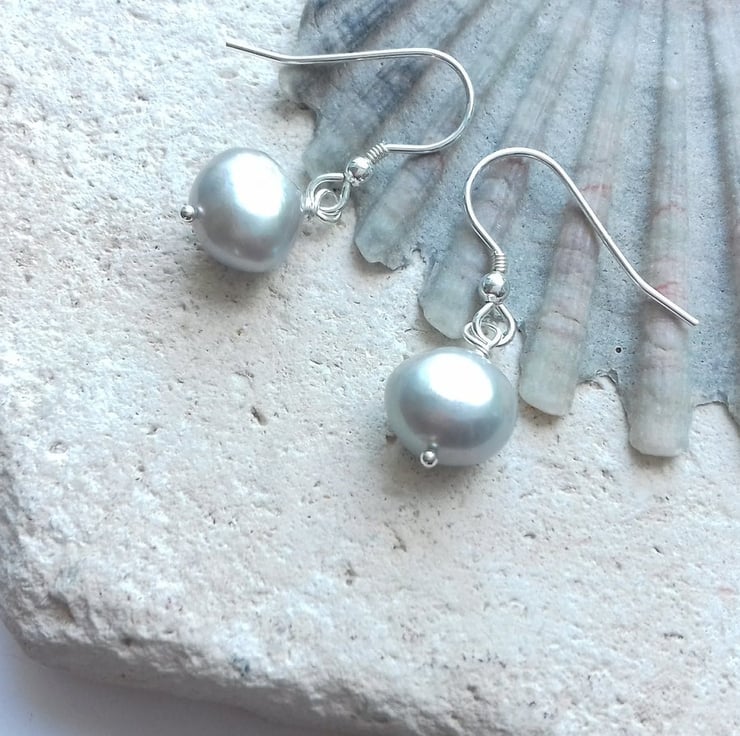 Grey freshwater pearl drop earrings with sterling silver ear wires.