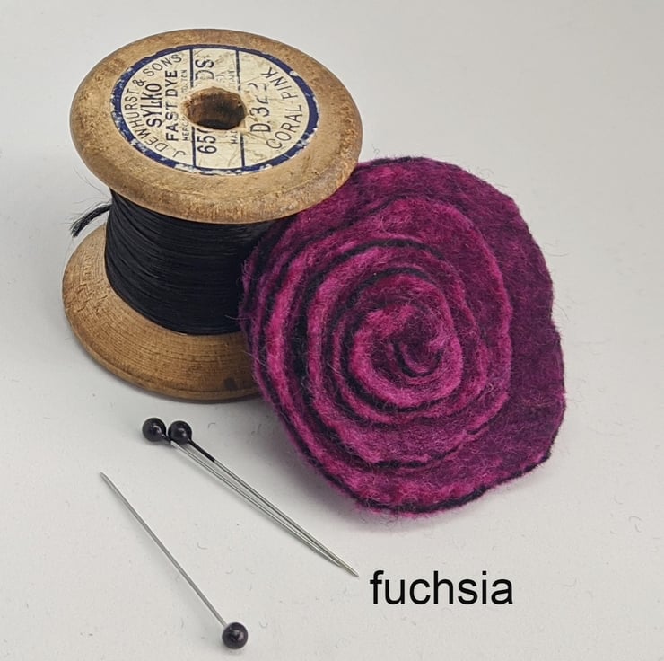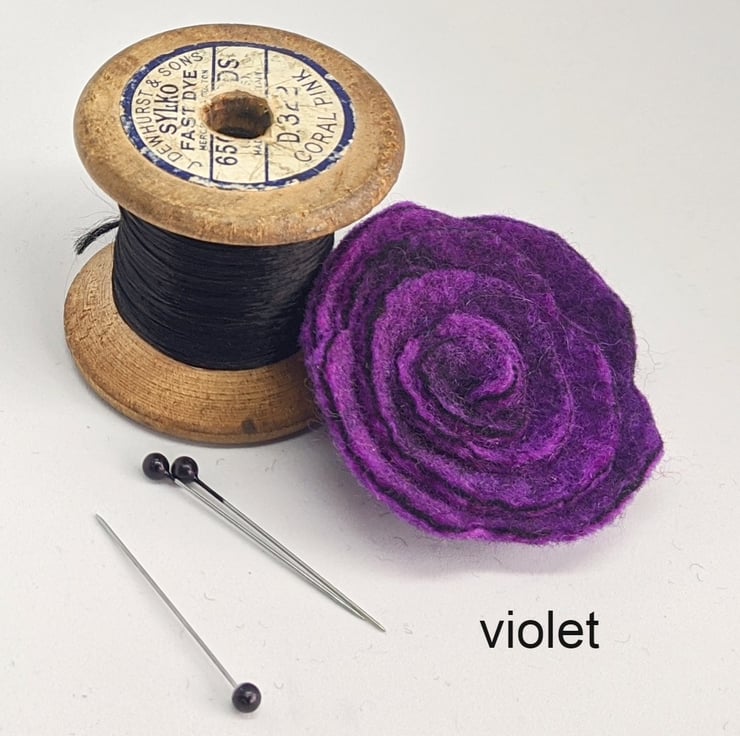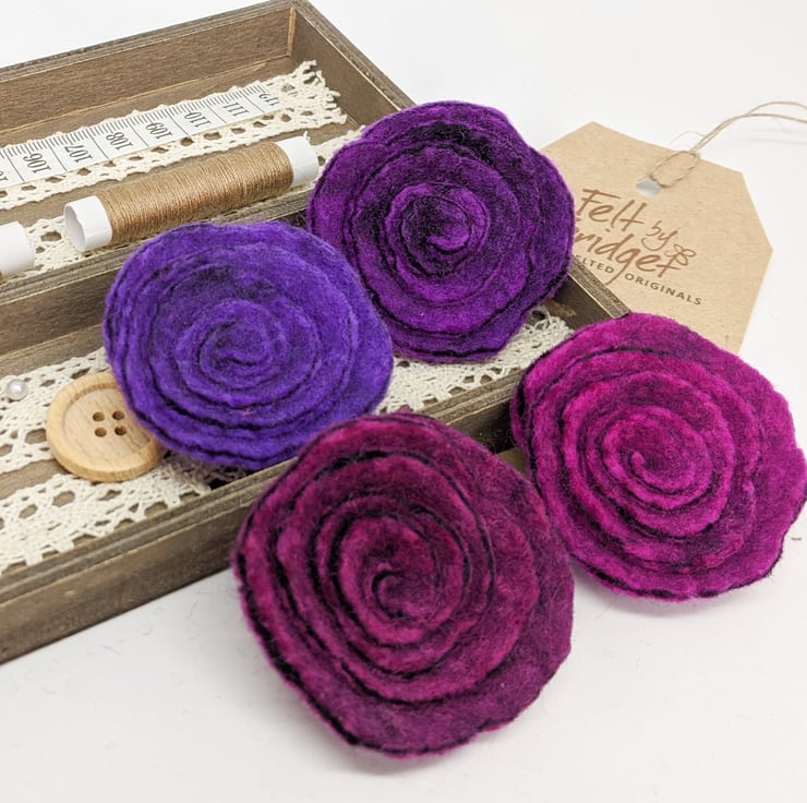 Using traditional wet felting techniques I felt together 3 layers of merino wool, then cut to expose the middle layer of black. This gives the flowers their distinctive art deco look and their depth of colour.