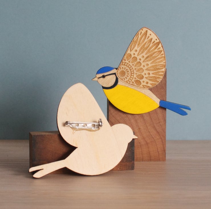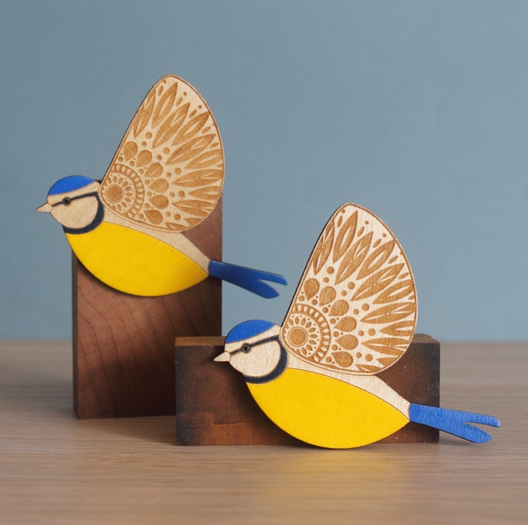 This pretty little blue tit has been cut and etched from 3mm birch ply and hand painted in bright yellow and blues. His wing has an etched folk art style pattern for a bit of added fanciness!