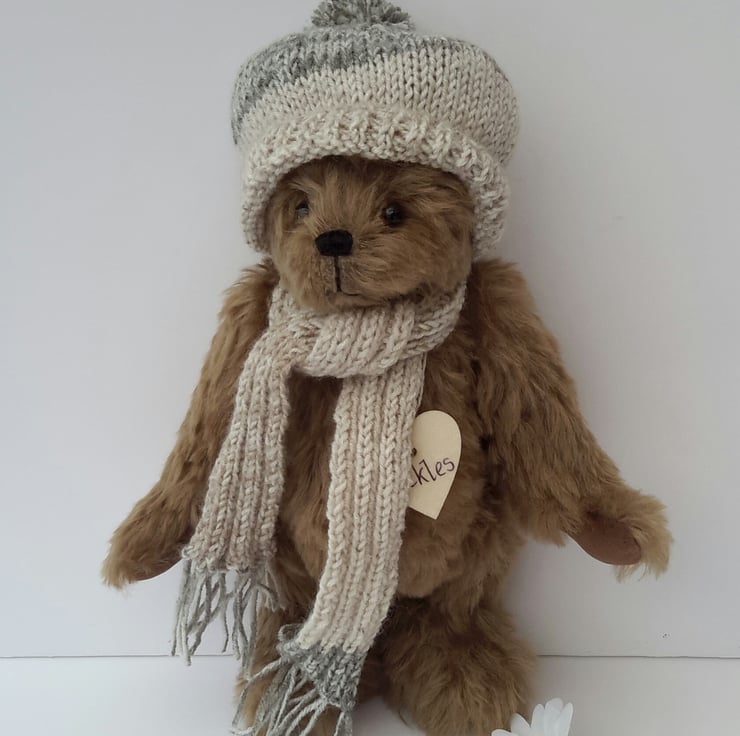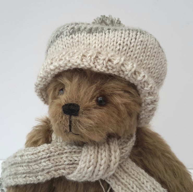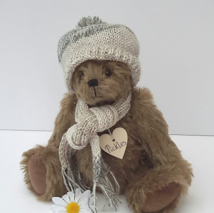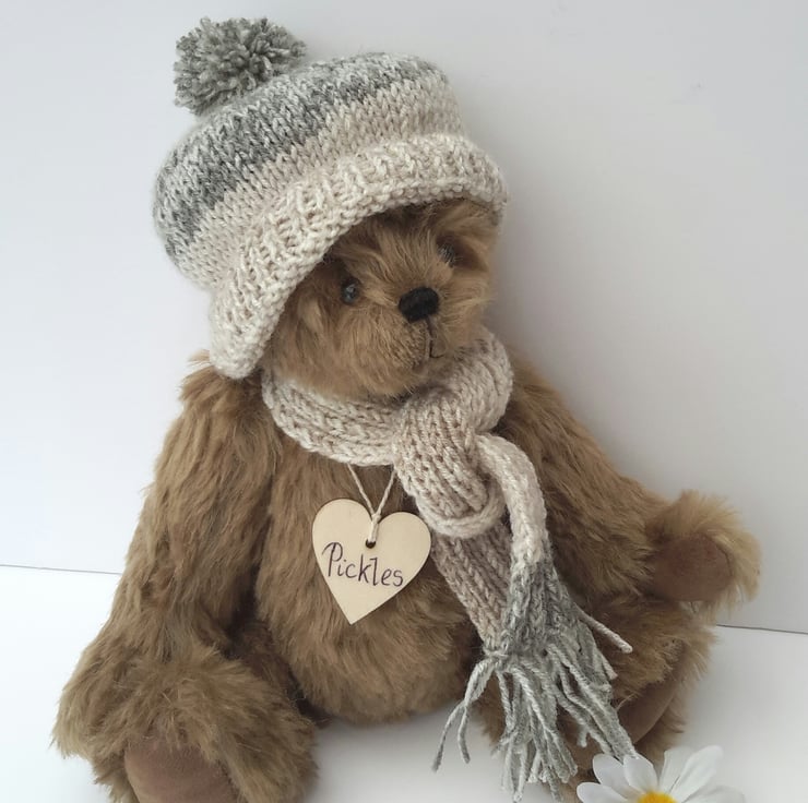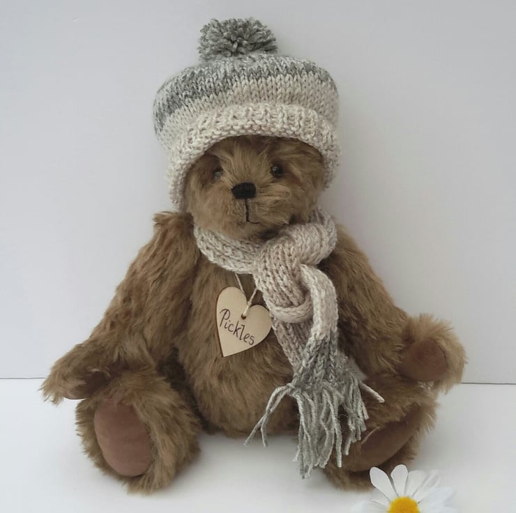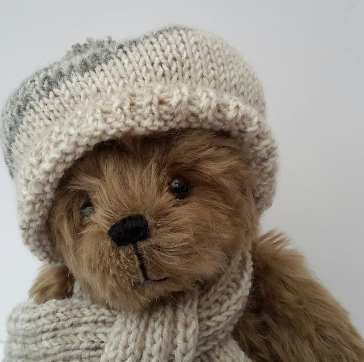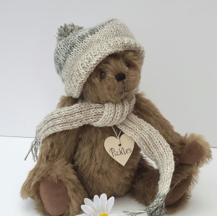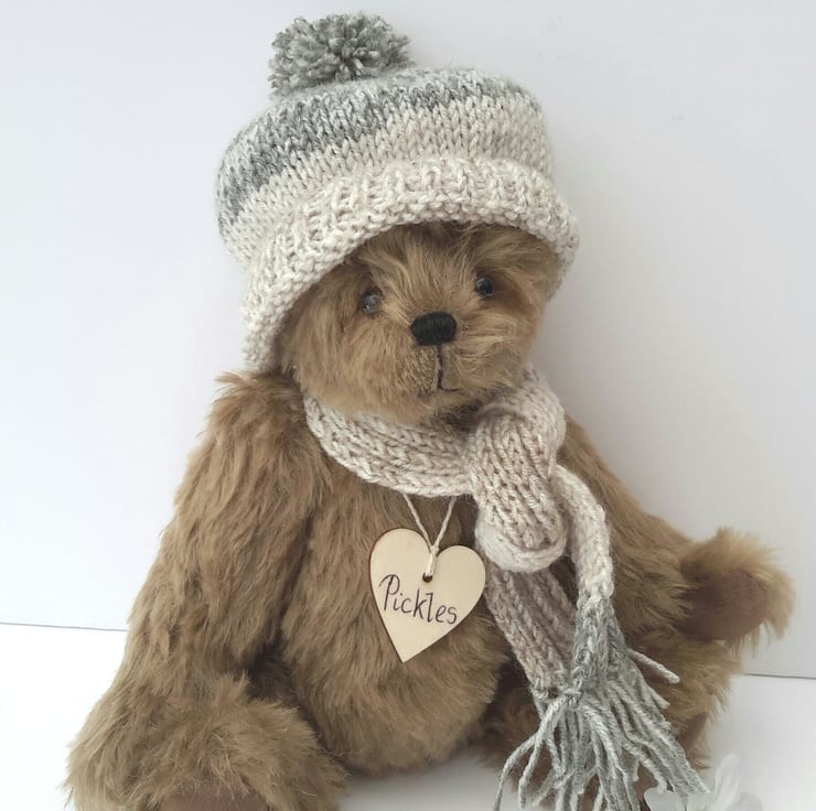 Pickles is a lovely winter bear, dressed in a hand knitted bobble hat with matching scarf to keep him warm during the winter months. Knitted from a lovely linen effect yarn with a splash of green.