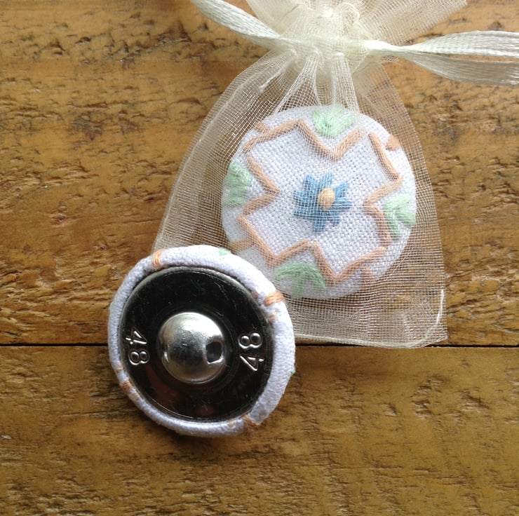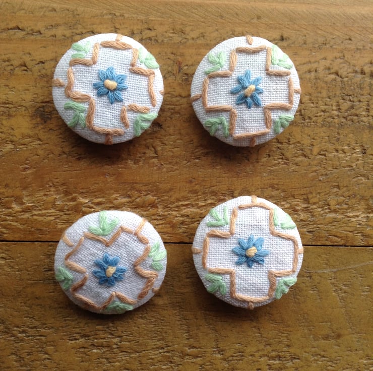 I have made these buttons of a detail from a vintage embroidered tablecloth. I have a special fabric button covering machine to do this. They measure 3cm in diameter.
