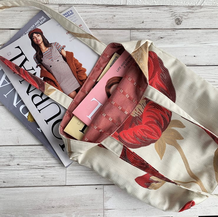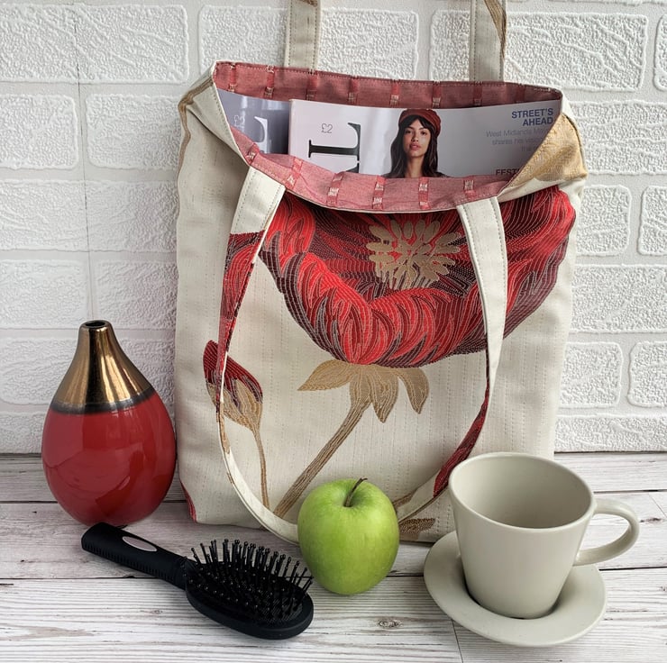 This tote bag is very versatile - perfect for use as a shopping bag but pretty enough to be used as a handbag. With its luxurious jacquard fabric, stylish red and gold colours and bold floral pattern, it would be perfect for a special occasion or would make a lovely gift.