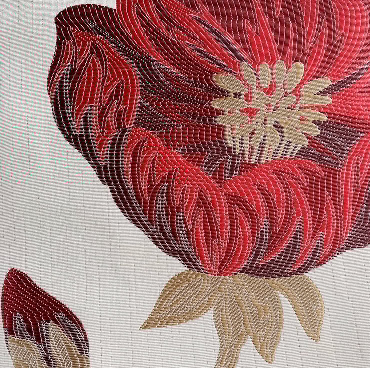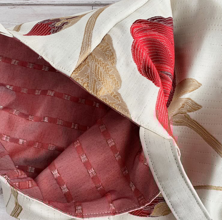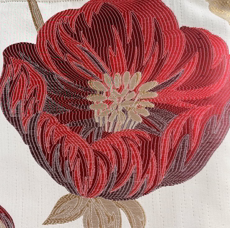 A luxurious tote bag in lovely jacquard fabric featuring a large red and gold flower on a cream background. The flower is made up of many shades of red with gold stamens in the centre. The stem and foliage is gold and there is also another red flower in bud. The bag is lined with red fabric with a subtle stripe pattern in the weave.