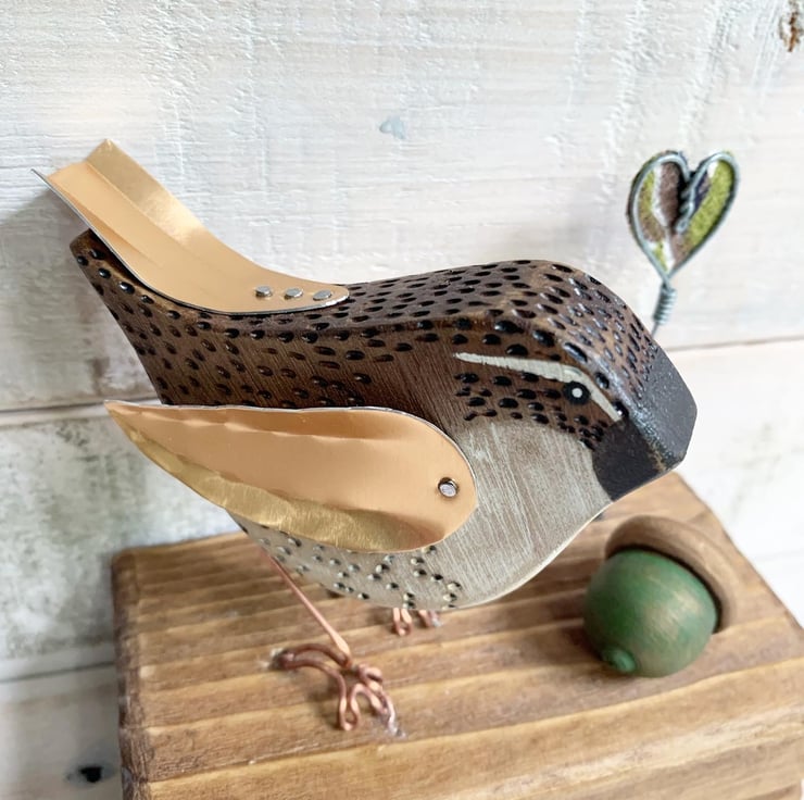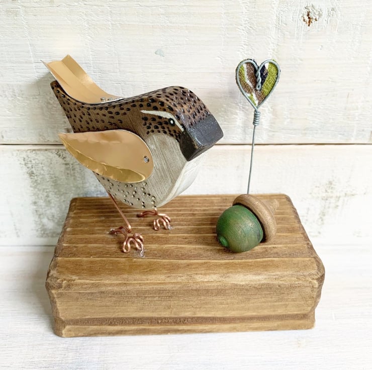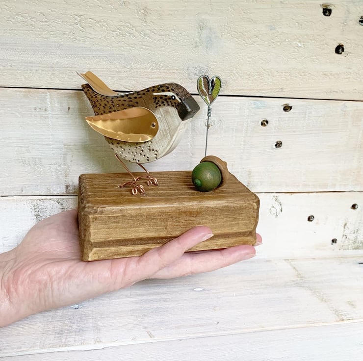 Crafted from wood, this little Wren sits on a wooden base with acorn and vintage fabric/wire heart.