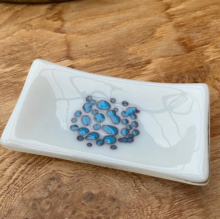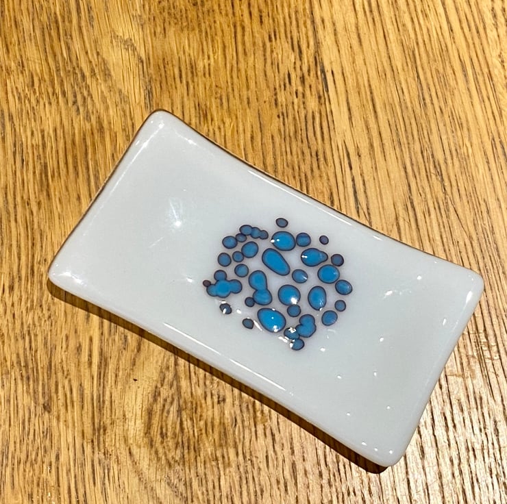 This shallow dish measures 12.5cm x 6.5cm and is ideal for jewellery or trinkets or as a small soap dish. The blue and white glasses react together to produce the ‘halo’ effect around the decorative elements.