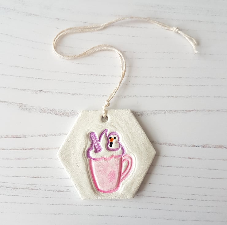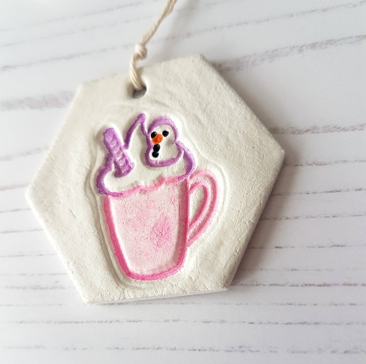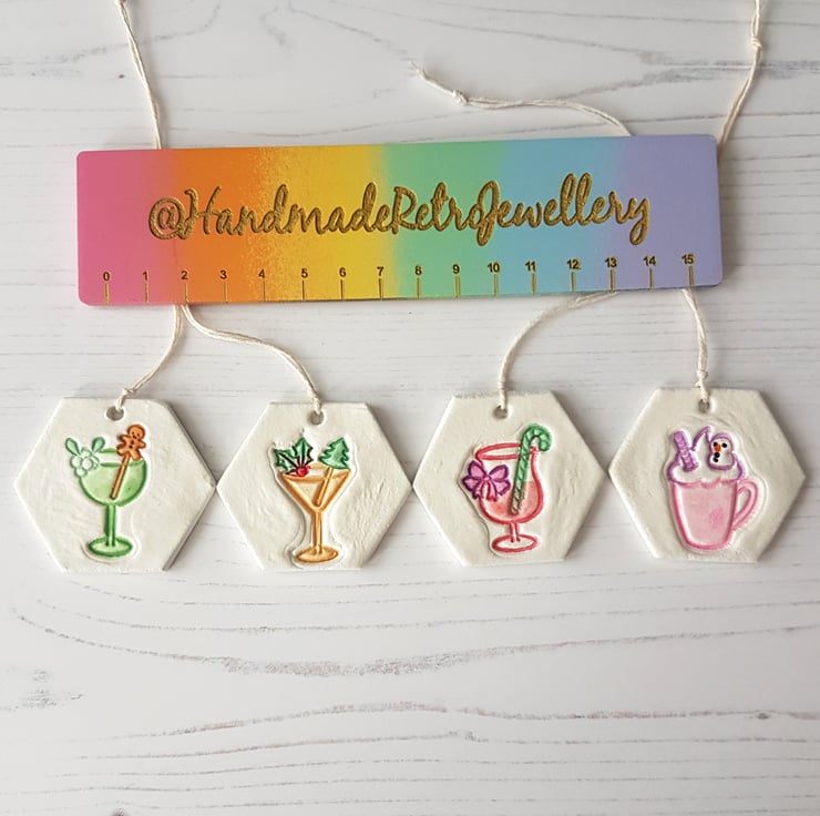 Hand stamped into air dry clay, then finished off using a dryer, and finally hand painted detail added using acrylic paint. The piece is then sealed with a varnish to protect, with some baker's twine added to hang in your home at Christmas! Or how about using them as place settings for dinner?